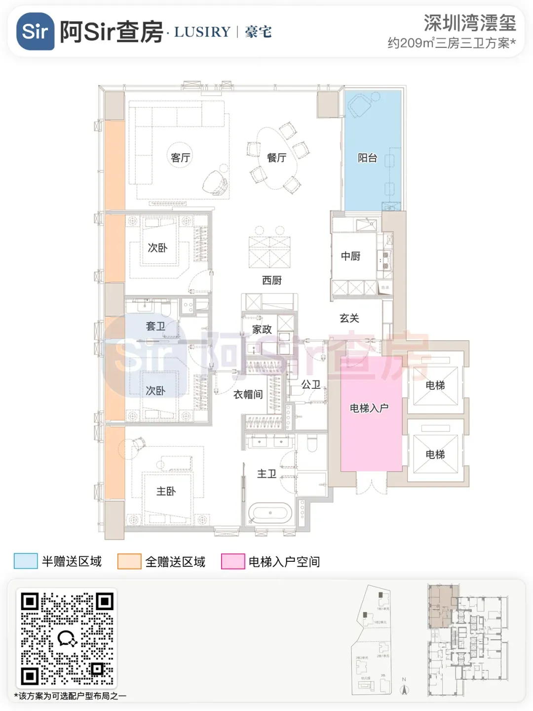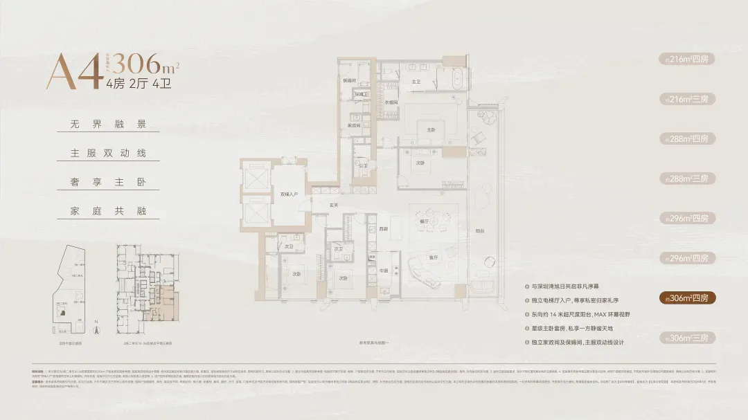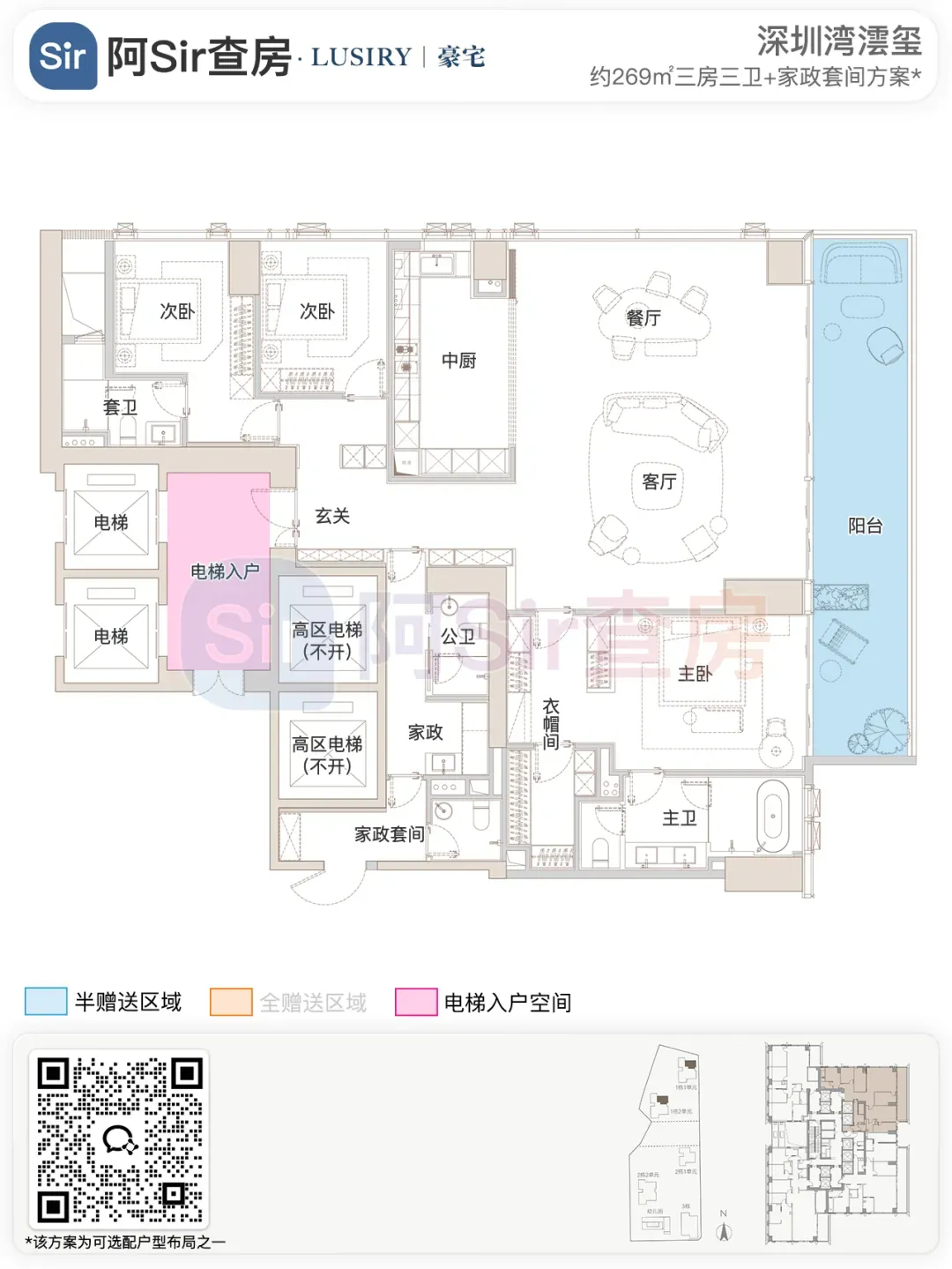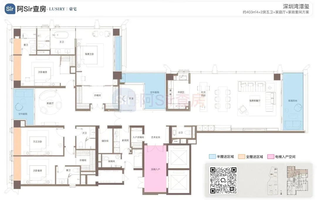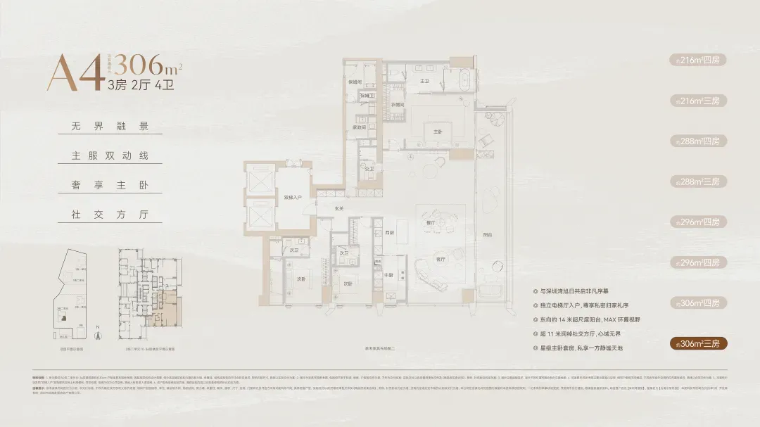 而位于1-1栋的北面距离「中海油大厦」比较近,在家里的北向落地窗都可以像《单身男女》一样,跟对面中海油小姐姐传情了。269㎡是209㎡的隔壁户,同样有两个方案可选,也是分为 三房三卫+家政套间 和 四房三卫+家政套间。最直观的区别也是把其中一个次卧改成了客厅,两个方案对比如下:- 269㎡三房三卫+家政套间方案把动区扩大串联超大阳台,光餐客厅有约65㎡,算上整个LDKB超过100㎡了。优点:整个动区超过100㎡,老实说Sir认为这个户型更应该做三房方案,太享受了,除了砍点实用性外没啥缺点。客厅动区空间穿插了一个次卧,可以满足大部分家庭的刚需居住空间。优点:实用性强,四个卧室基本上满足大部分家庭的刚需居住空间。不足:虽然增强了实用性,但玄关到客厅显得过道稍长,动线歪曲,不如三房户型来得开阔,且过道偏暗。阿Sir查房前期针对「深圳湾澐玺」组织了多次线下沙龙,当时不少老友们深度了解后纷纷考虑从209㎡加预算转投269㎡户型。主要考虑到该户型位于1-1栋的东面正对着街心公园,楼间距开阔,而1-2栋的东面对着小区园林,视野观感也非常舒服。对于景观和视野有执念的话,269㎡户型确实有更好的体验。另一个展示的样板间是295㎡户型,这个户型我现场细品了觉得尺度感不错,比单纯看户型图更能体现出来,整个室内空间非常之大,LDKB整体达到了90㎡左右。样板间展示的三房四卫+家庭厅+家政套间,另外还有一个可选方案就是正儿八经的四房四卫+家政套间,区别在于家庭厅的位置被拆分成了卧室和衣帽间。这个户型的功能设置和动线基本上可以满足二知三胎家庭的居住需求,不仅最大能够做到4+1房的功能,还有单独的家政套间,设计了主仆双动线。这里两个方案实质上都是可以有四个睡觉的空间,就不拆分来讲了。最大的优点是在中低区户型里实用性最强的,室内空间目测比305㎡还大。整个餐客厨的空间很开阔,阳台向东,客厅南向有5.8米的采光面,现场看这阳台并不小,毕竟有2.4米的深度,是个空间比例很好的阳台,好用。房间采光朝西,会有西晒,这方面虽然可以通过空调等高科技设备解决,不过西晒仍是不少人心中的隔阂,如果特别介意这个朝向则只能避开,去考虑269或305㎡的大面东向户型。另外有的老友说主卧门开在厅堂,呃,这个其实还好,毕竟主人家应该是在厅待到最晚的,而小孩住的次卧相对早睡,更应该远离动静大的客厅。如果次卧放到厅旁,晚上都不敢在客厅活动影响孩子休息。305㎡也没做样板间,同样有两个方案可选,也是分为 三房四卫+家庭厅+家政套间 和 四房四卫+家政套间,最直观的区别也是把其中一个次卧改成了客厅。两个方案对比如下:305㎡户型本质上是中低区里最动人的,即使它的阳台要花掉了两百多万,室内空间还没有295㎡大,动线稍微有点不完美,但坐落在东南角、空间分布均匀和全落地窗等还是让人无法太抗拒。老实说都305㎡还做三房的话,从理性角度看是不那么接受的,可能还没到那个level吧。而且动区如果想做大,把次卧敞开还不如把中厨敞开来得舒适。东南朝向,且两边都有园景,LDKB(餐客厨阳)空间有约86㎡,东向大阳台从客厅联通到主卧有近35㎡的阳台就离谱。还带有三个标准套间,卧室的空间分布均衡且好用。光看图没啥,后来对比后觉得比较遗憾的一个点客厅南侧开间只有5.1米,不如295㎡的5.8米南侧开间。如果想把动区做大,改中厨是最好的方式,但是中厨的灶台设在客厅墙边,如果改做半开放式中厨成本就会稍高,折腾。375㎡分两种户型,一个在东南户,一个在西南户,景观面都朝东看海。西南户大客厅独享东南向视野,与餐厅与起居厅共同组成了超尺度的大公区,并拥有西向的景观阳台。主卧室独享西南向转角位置,配以双向景观视野。
