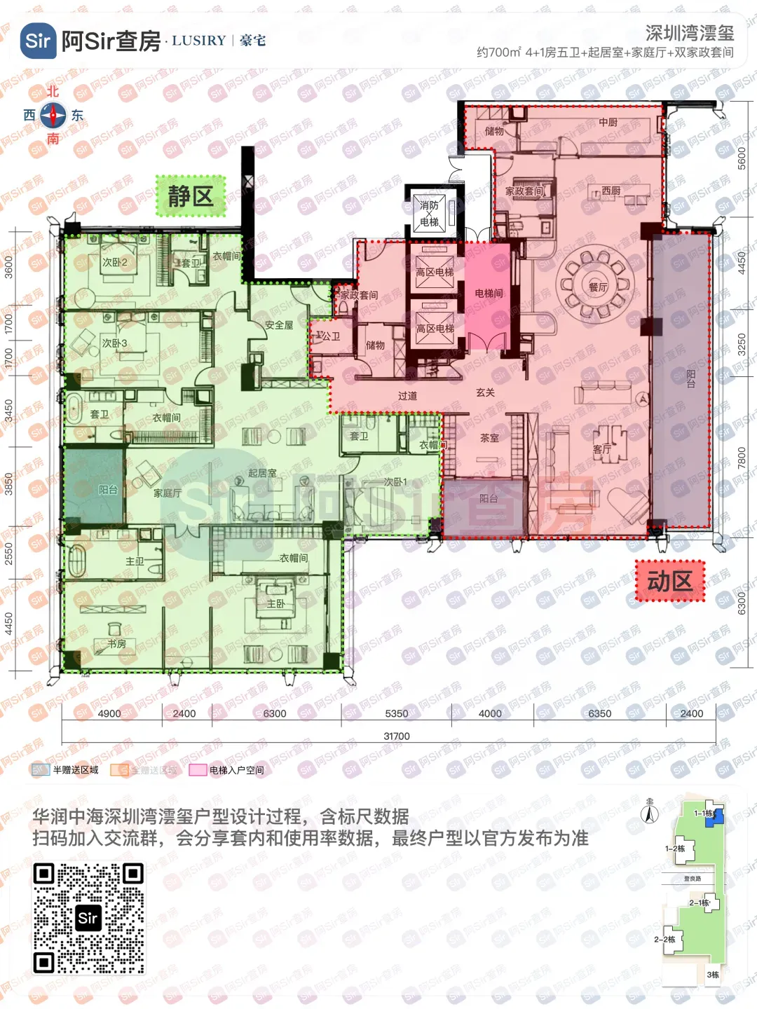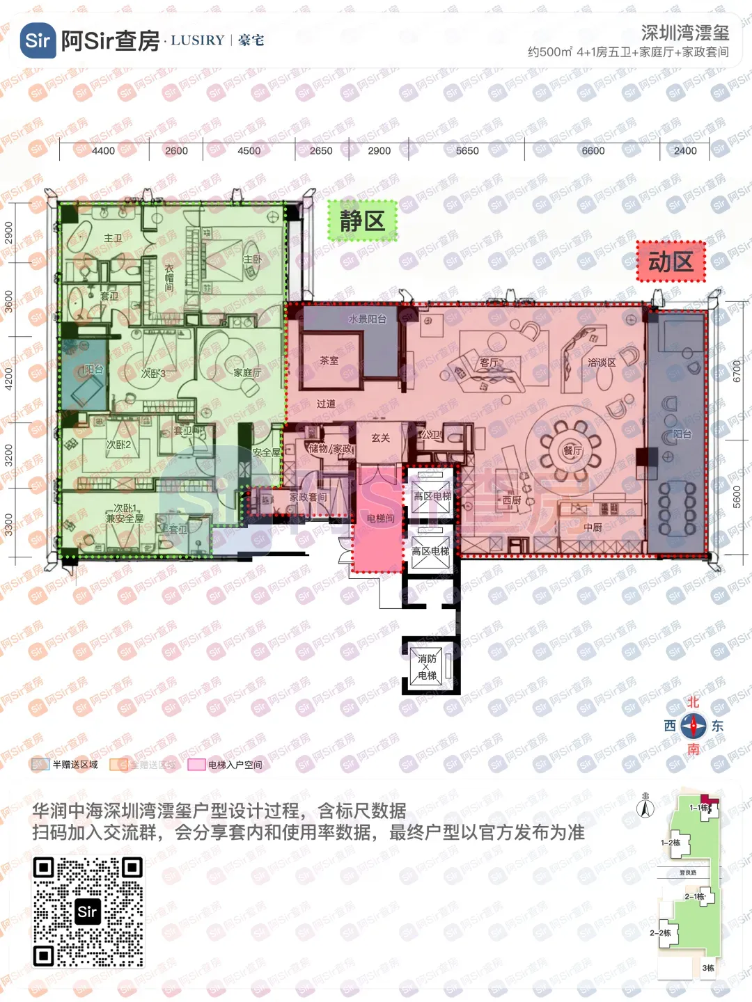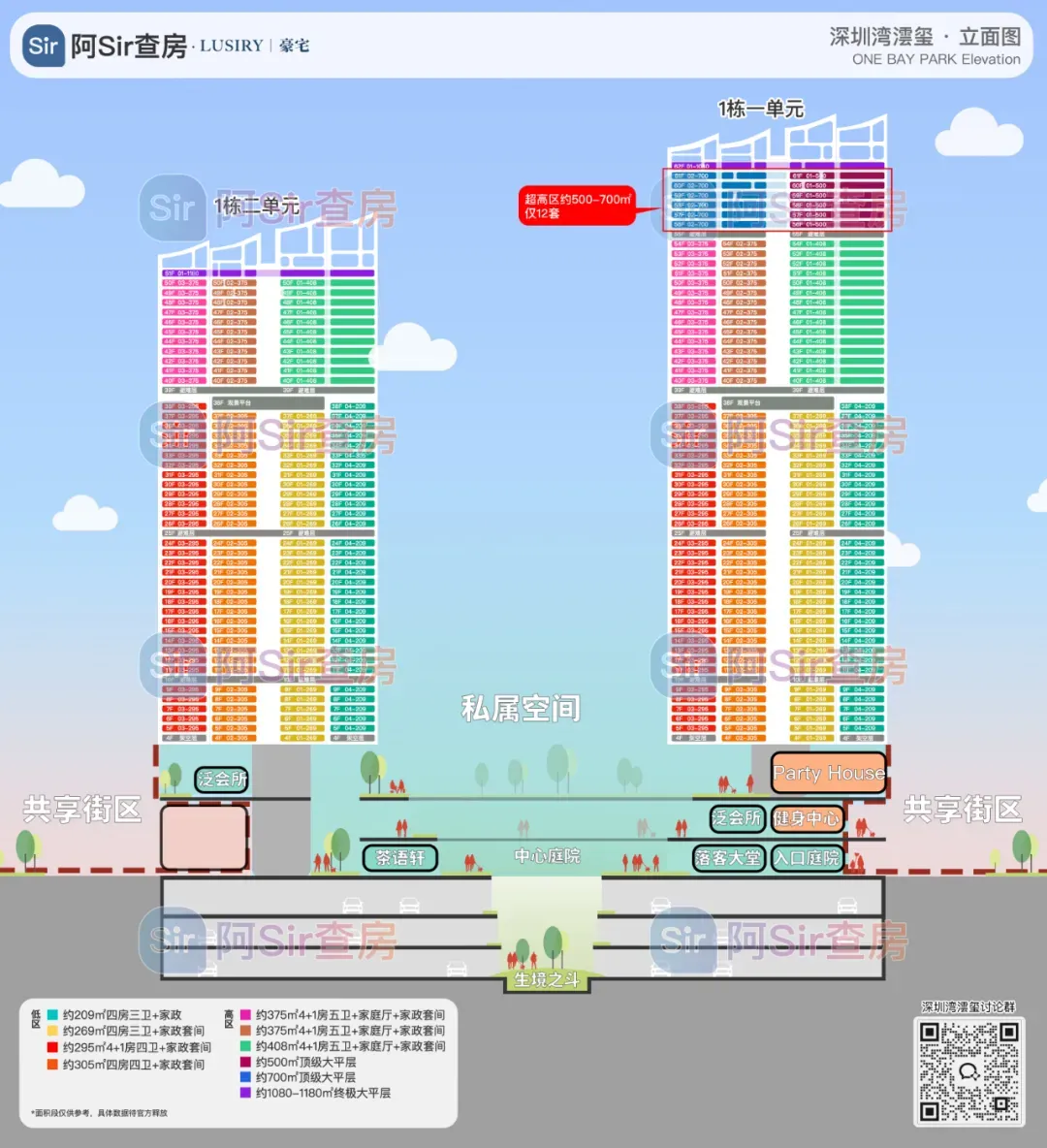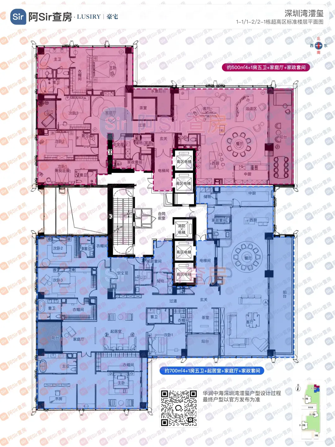 375㎡东南户景观与朝向俱佳,东南向转角公区尽享优质视野,配以约15米超长跑道式景观阳台。主卧安静私密并拥有独立东向景观阳台,还可以配置独立安全屋/珍宝室。403㎡户型的内装由于舍于昭老师设计,是我最喜欢的内装风格,无奈实力不允许上这趟车。主阳台朝东,大面积朝北,不过由于三面采光的关系,其实整体户型采光没有任何问题。设计上做到了动静分区,居住体验相信是很好的。主要是首批推售的时候定价并不高,我认为是非常具有性价比的一个户型。位于1-1栋的超高区200米以上,仅12套约500-700㎡的超级大平层(两个户型各六套),这个段位是5梯2户的结构,资源优势得天独厚,全小区仅1-1栋拥有。整层分为南北两户,北侧约500㎡,南侧约700㎡,均拥有环幕式视野景观。两户均以东西向作明确的公私分区,将东侧区域作为动区,西侧为居住静区。约500㎡户型入口结合入户阳台为对景,东侧配置超大尺度餐客厅,西侧以家庭厅为核心,配置了四卧全套房。