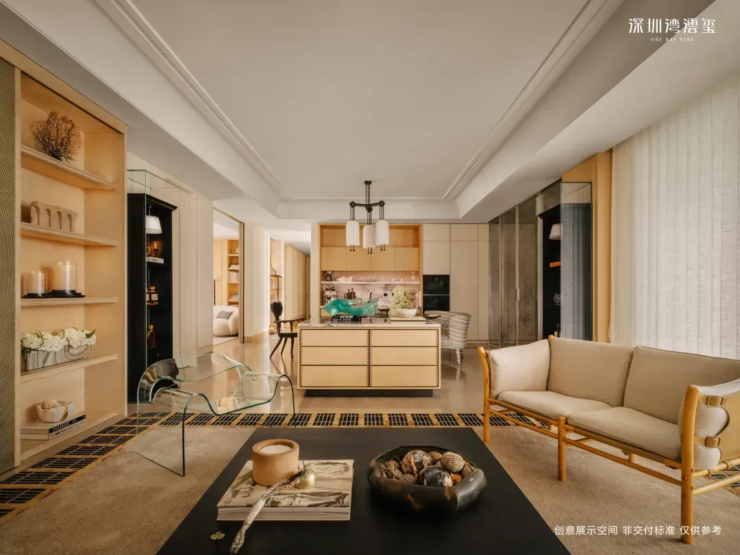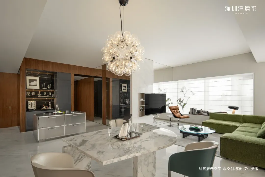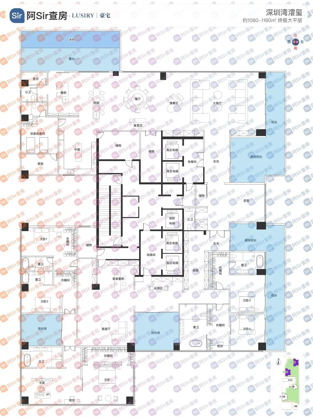 像这种小目标级的房子,内部空间足够大,格局是怎么玩都行,我们就静静地欣赏好了。其中700㎡选择傅厚民(Andre Fu)设计,傅厚民是项目最重磅的国际大师之一,比较经典的案例是京都「三井酒店」、东京「四季酒店」、前海「瑞吉酒店」等。他还没有在深圳设计过住宅业态作品,这次是深圳住宅首秀,非常值得期待。北区1-1栋,1-2栋的顶楼各有一套约1080-1180㎡的顶级大平层,全小区共2套。这个户型位于塔楼顶端,当之无愧的深圳Penthouse,享顶部绝版位置,坐拥城市之巅的顶级视野景观资源。室内超1000㎡阔尺面积,在深圳找不到这么大的标准平层,足以实现各类奢侈居住空间。