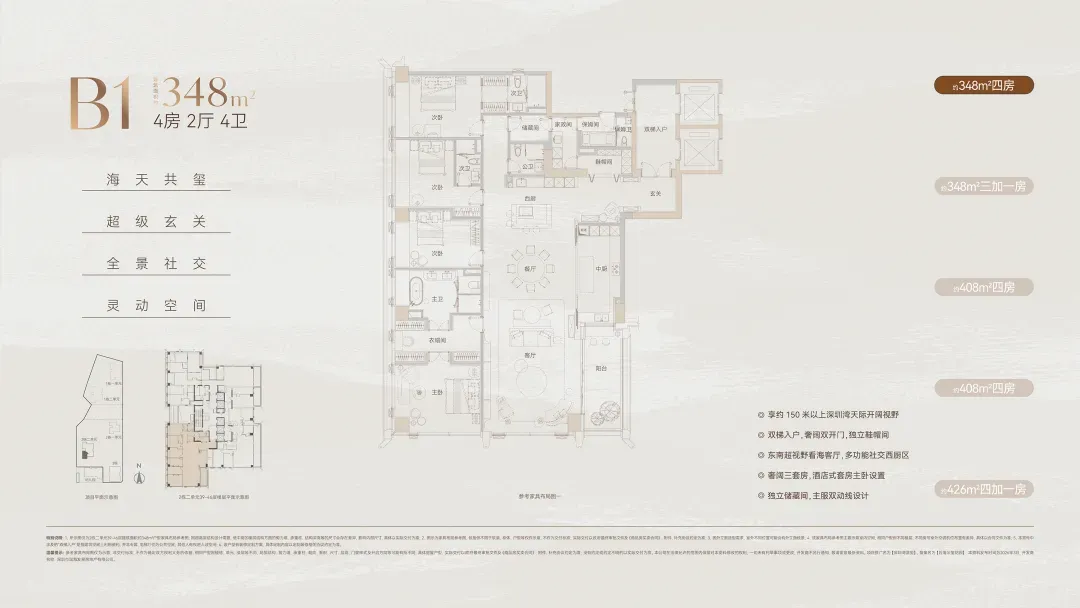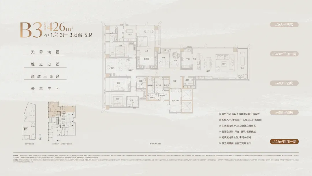 据悉349㎡由于跟过去375㎡相比户型改动较大,会有全新的风格让人会眼前一亮,值得期待。- 426㎡4+1房五卫+家庭厅+保姆套间
