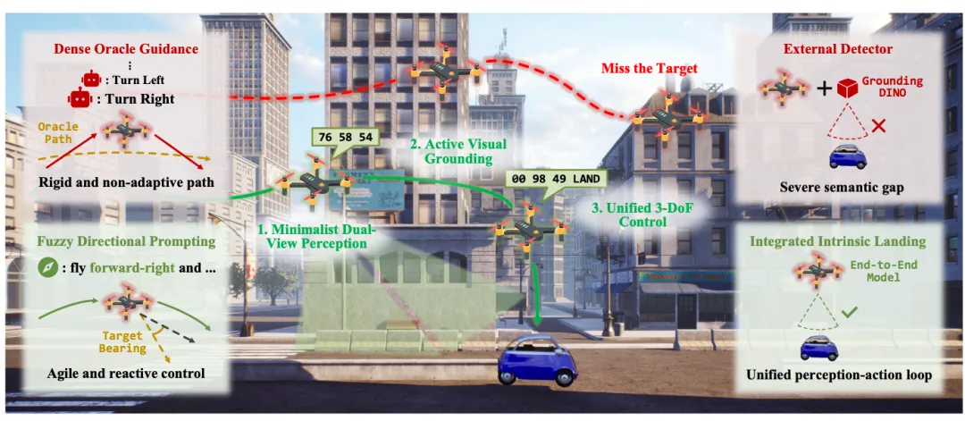 对应原文Fig.1:无人机导航范式对比图AerialVLA正是为了解决这一"双拐杖"问题而提出的。它建立了统一的感知-动作回路,用模糊的机载方向提示替代精确先知,用内在的着陆策略替代外部检测器,使无人机真正实现自主导航。