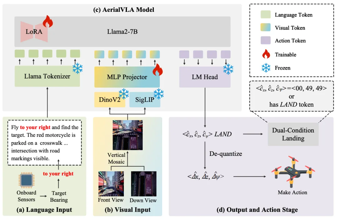 对应原文Fig.2:AerialVLA整体架构图AerialVLA的整体架构如图2所示,基于OpenVLA-7B骨干网络构建,核心包括混合视觉编码器和Llama 2语言模型。框架接收多模态输入(语言提示和双视图图像),通过自回归方式预测数值控制标记,最终解码为连续的物理控制命令。以下逐一介绍各个关键模块。