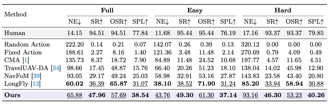 未见目标(Unseen Object)。 AerialVLA以56.60%的SR保持领先。基线方法由于依赖显式目标检测器,在面对训练时未见过的目标类别时识别和停止能力受限。AerialVLA则直接将新颖的视觉概念关联到控制动作,表明其极简框架有效利用了LLM中的开放词汇表征能力。