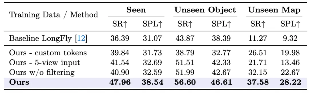- 数据过滤的作用:在未过滤的原始数据上训练,未见地图SR从37.58%降至32.15%(下降5.43%),但仍保持接近LongFly三倍的优势,证明性能提升主要来自架构设计而非数据清洗。