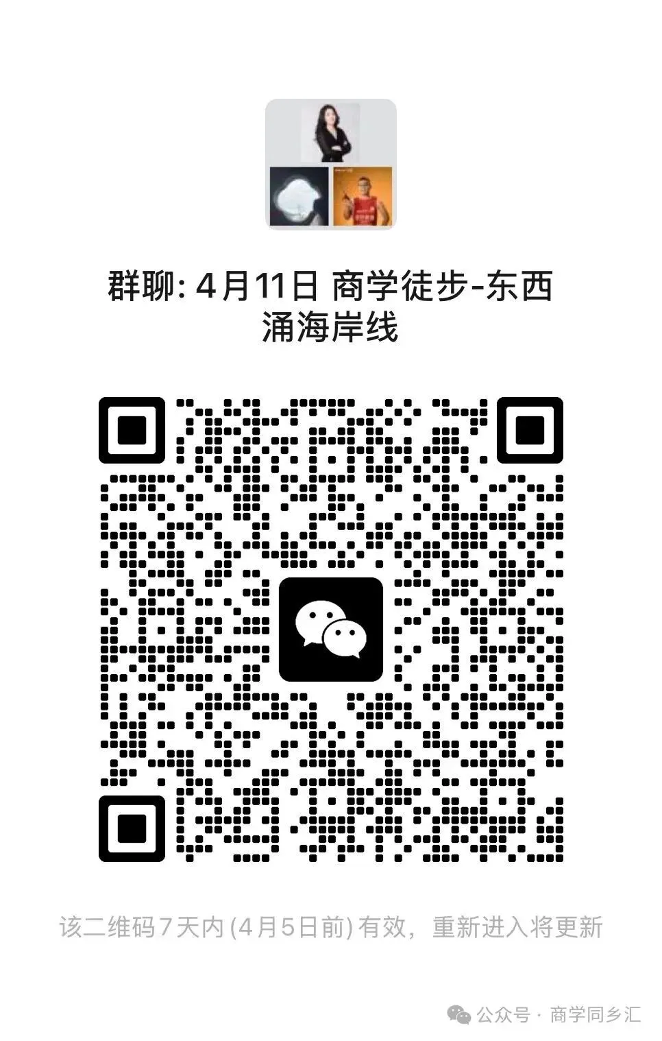 3. 报名成功后,请扫描下方二维码进活动微信群,了解活动当天出行信息,关注群内动态,活动当天各个上车点找点位集合负责人集合上车!
