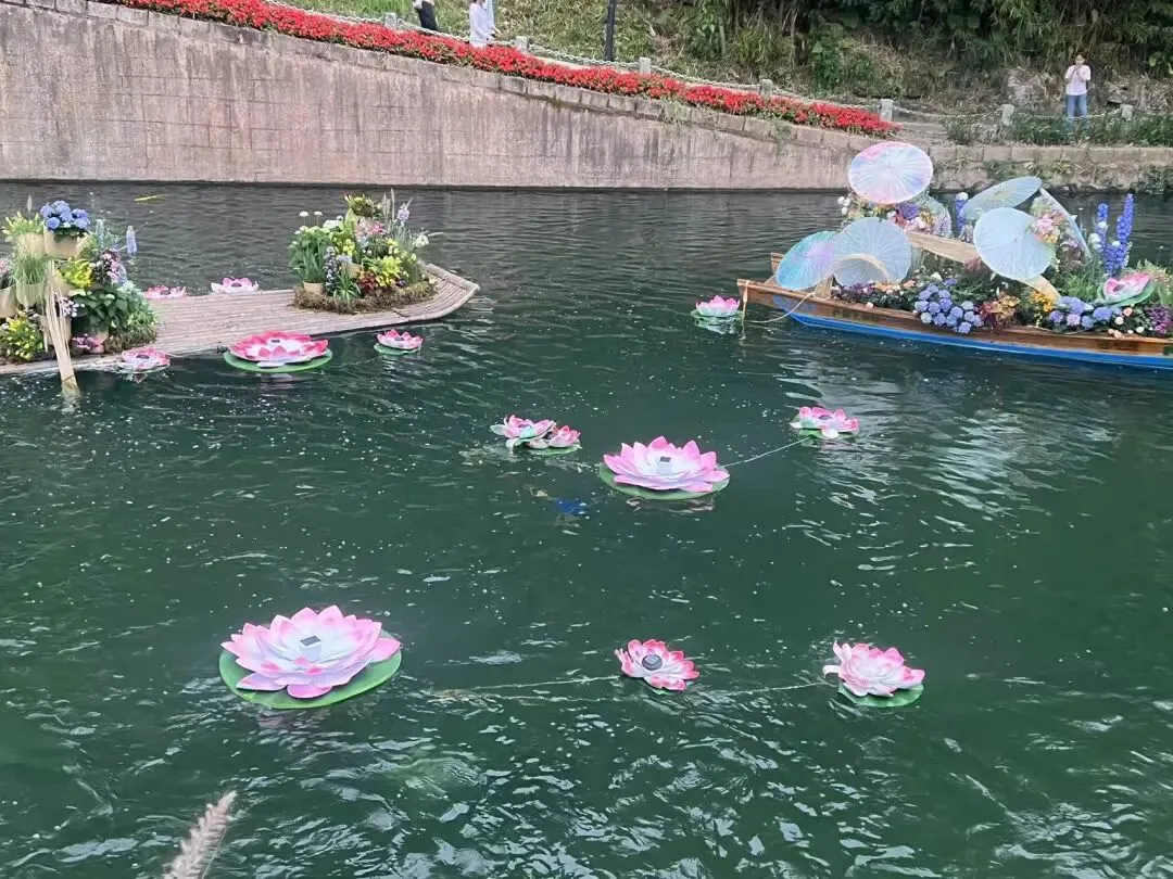 小河流淌着一艘艘“花船🚢”,鲜花💐非常的鲜艳,吸引了不少人在拍照📸欣赏。这种创意,充分发挥了地理环境的优势,把流水也用上了,水中花,花之倒影,更美。