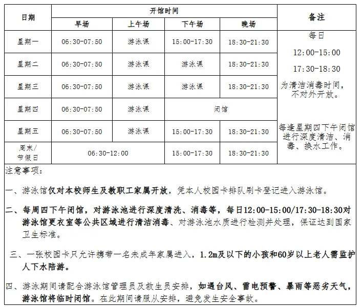 根据我校2026年春季课程及游泳馆工作安排,游泳馆将于4月1日起对师生开放使用。开馆前已完成设备检修及水质检测。具体开馆时间如下:
