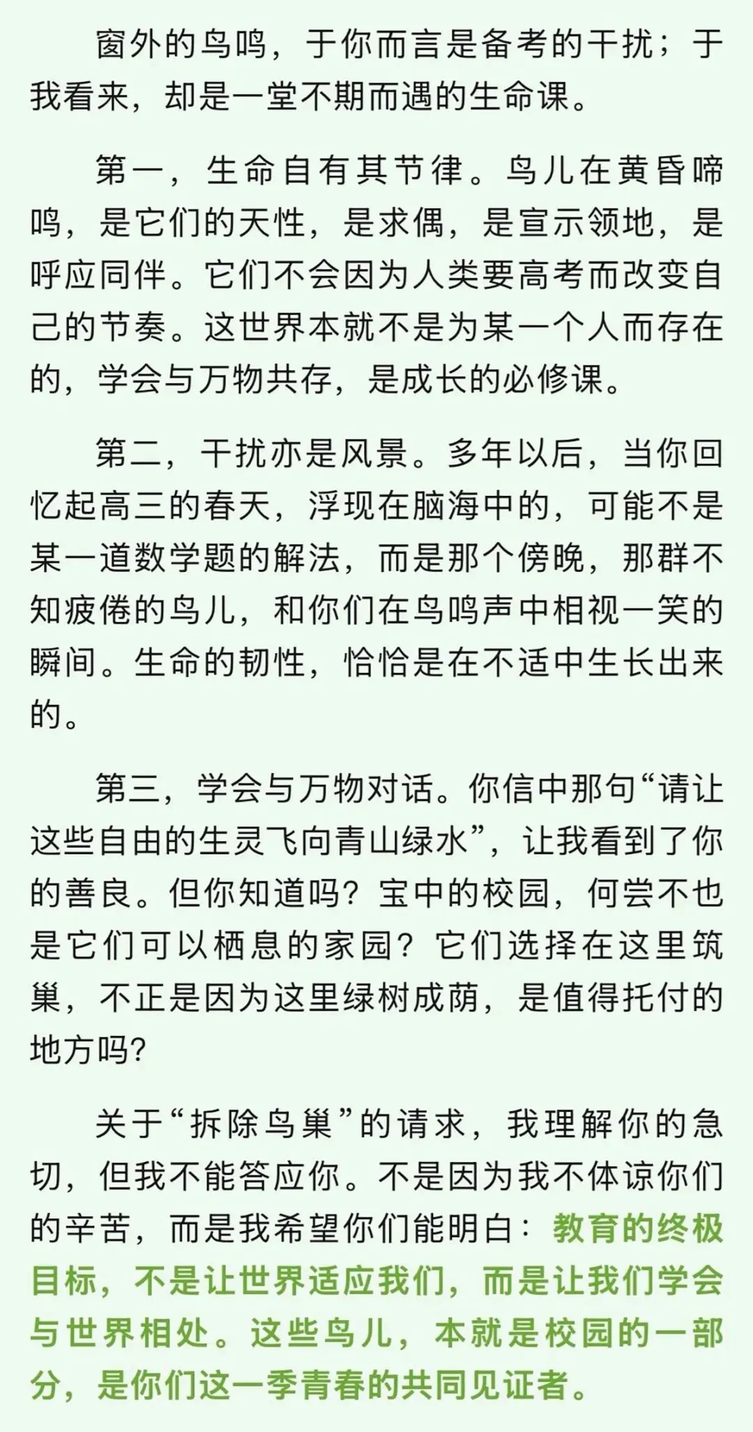 袁校长的回信正是如此。他从三个层面展开论述:生命自有其节律,干扰亦是风景,学会与万物对话。每一层都不是空洞的道理,而是贴着学生的感受展开——鸟鸣是天性,它们不会因高考而改变节奏;多年以后,回忆高三时浮现在脑海的或许不是某道数学题,而是那些在鸟鸣声中相视一笑的瞬间;校园是学生的家园,又何尝不是鸟儿可以栖息的家园?