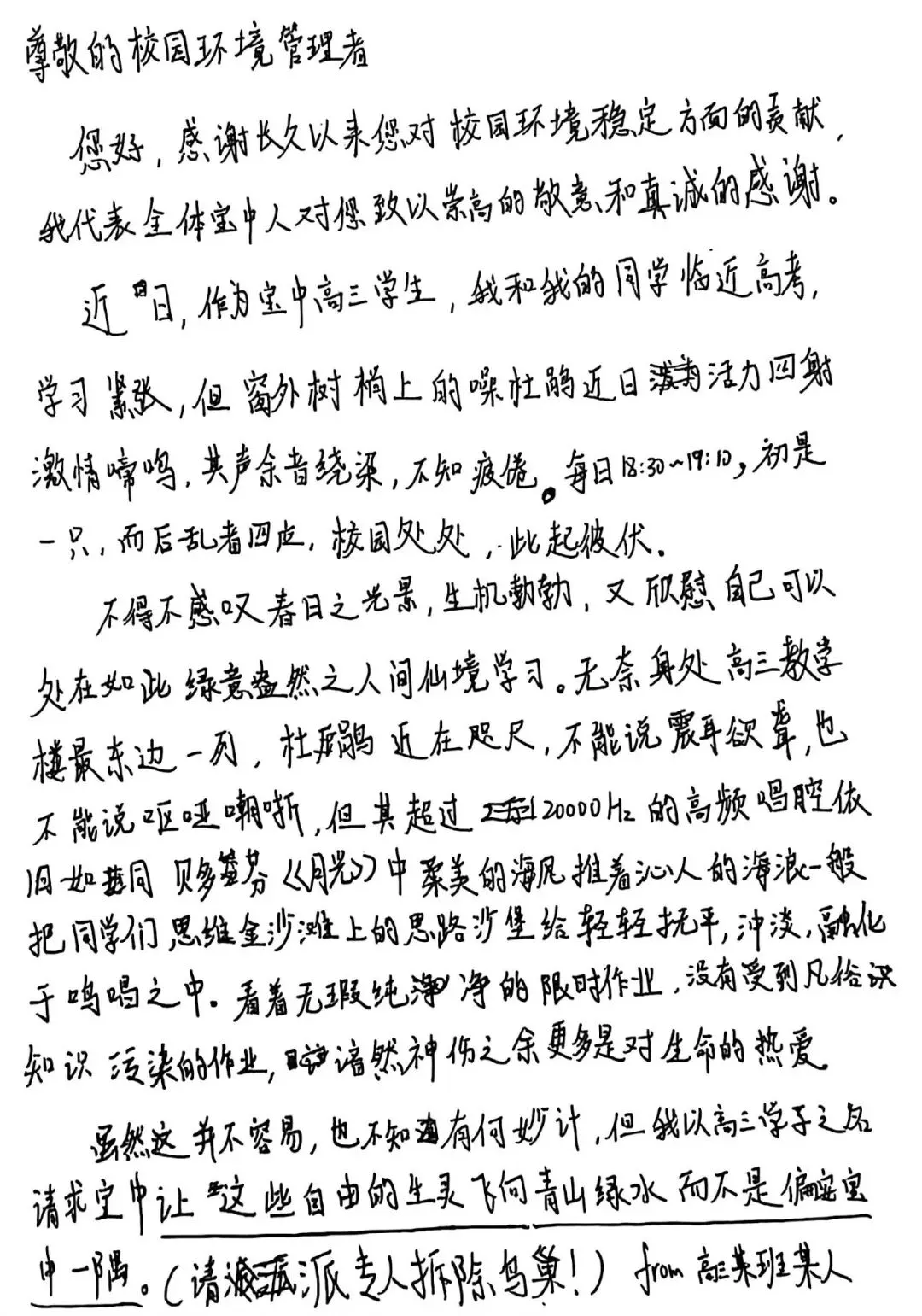 2026年3月27日,人民日报微信公众号推送了一则新闻:深圳宝安中学一名高三学生给学校管理者写信,因窗外鹃鸣不止,影响学习,请求学校“拆除鸟巢”。换作旁人,或许觉得高三了,压力大,想要个安静的环境,乃人之常情。可校长袁卫星并不这么看,也未采纳诉求,而是以一封回信的形式将这一“自然干扰”转化为一堂关于生命、自然与成长的教育公开课,引发舆论热议。这封回信刷屏网络,不仅因其字里行间流淌的共情与智慧,更因它触及了当下基础教育中的一个深刻命题:在追逐分数与效率的赛道上,我们是否遗忘了教育孩子如何与真实的世界温柔共生?