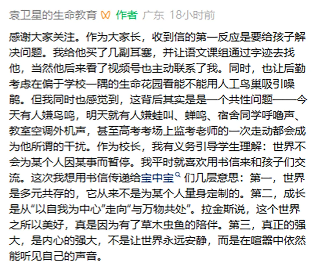 袁校长将这封学生来信视为一个“共性问题”的缩影。他说:“今天有人嫌鸟鸣,明天就有人嫌娃叫、蝉鸣、宿舍同学呼噜声、教室空调外机声,甚至高考考场上监考老师的一次走动都会成为他所谓的干扰。”正是这种对问题普遍性的洞察,促使他将个案转化为面向全体学生的教育契机。