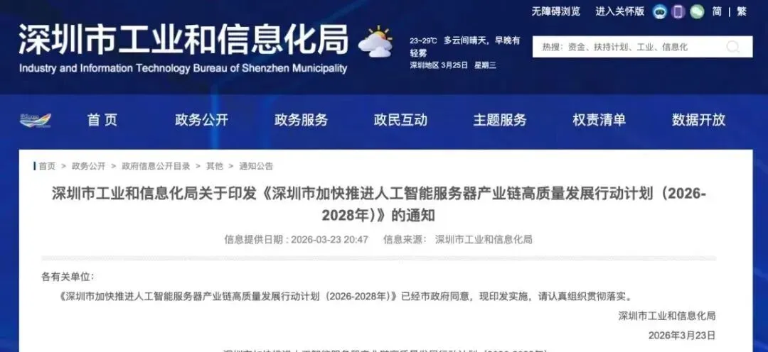 2026年,深圳市正式印发《深圳市加快推进人工智能服务器产业链高质量发展行动计划(2026-2028年)》,明确提出要打造“全球领先的人工智能服务器产业集群”。