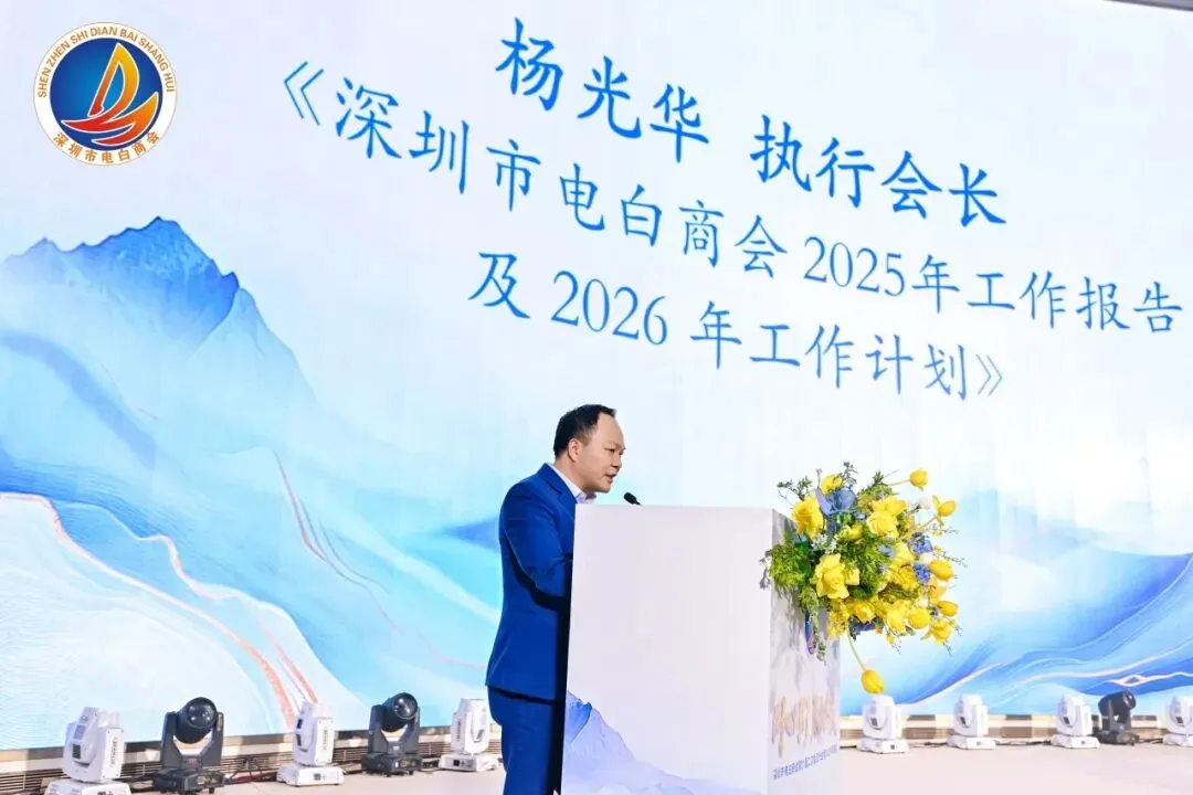 深圳市电白商会执行会长杨光华上台作2025年工作报告及2026年工作计划,全面回顾了过去一年的工作成果,并展望了新一年的发展蓝图。