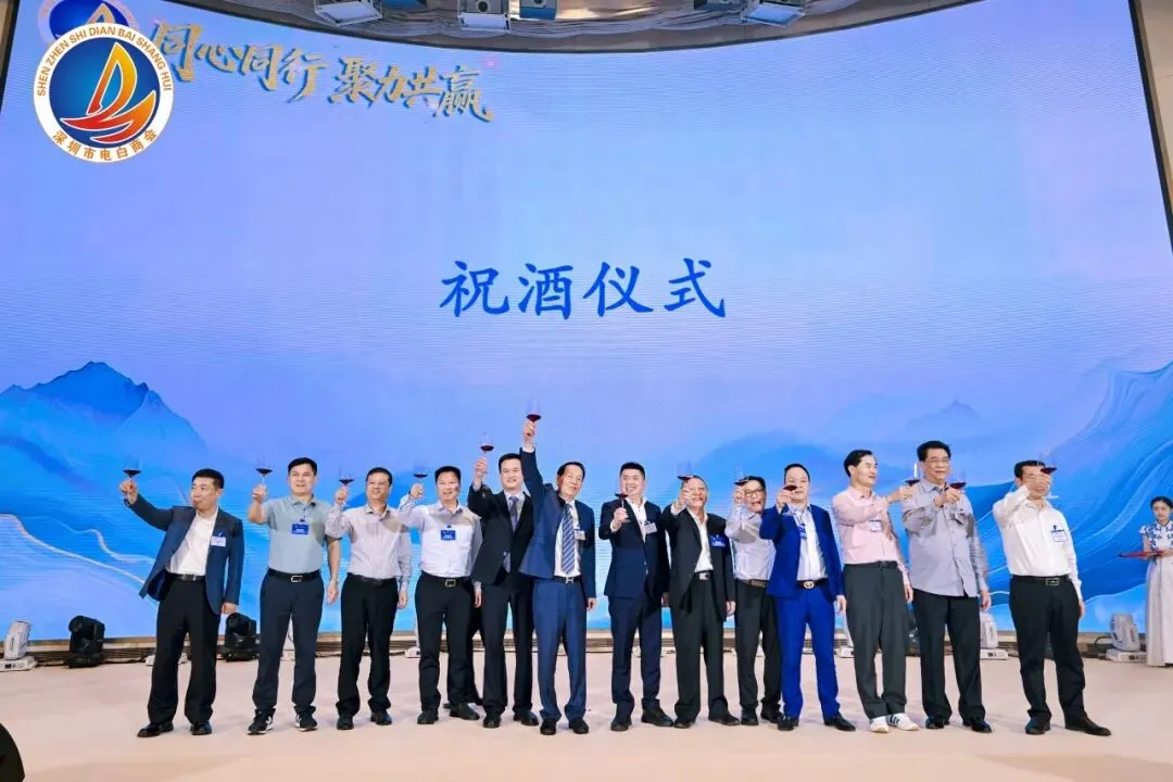 在热烈的掌声中,蔡万江会长携同吴茂常委、王明旺主席等领导共同上台祝酒,全场举杯,共庆盛会,共祝未来。