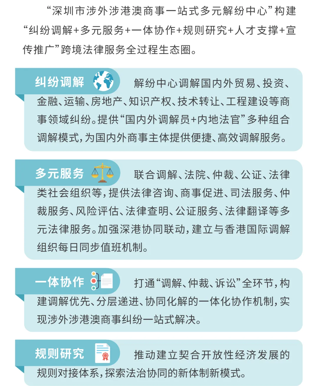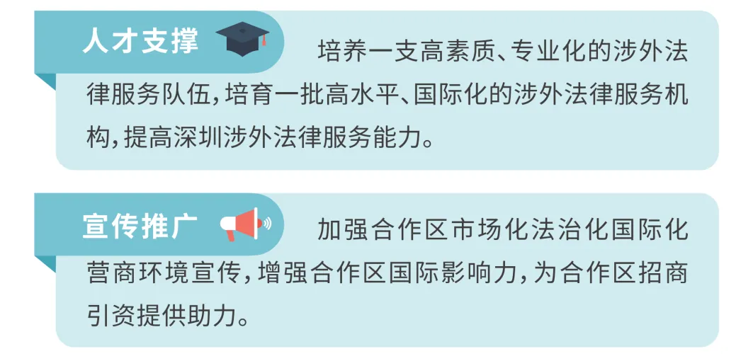 以“跨境衔接、全球服务”为导向,提升涉外法治服务能力,提出推进跨境法律规则衔接机制对接、构建企业出海法律服务体系、加强前海、河套等重大战略平台法治建设、打造国际商事争议纠纷解决优选地、加快建设国际一流仲裁机构、加强涉外人才培养交流等6项任务。