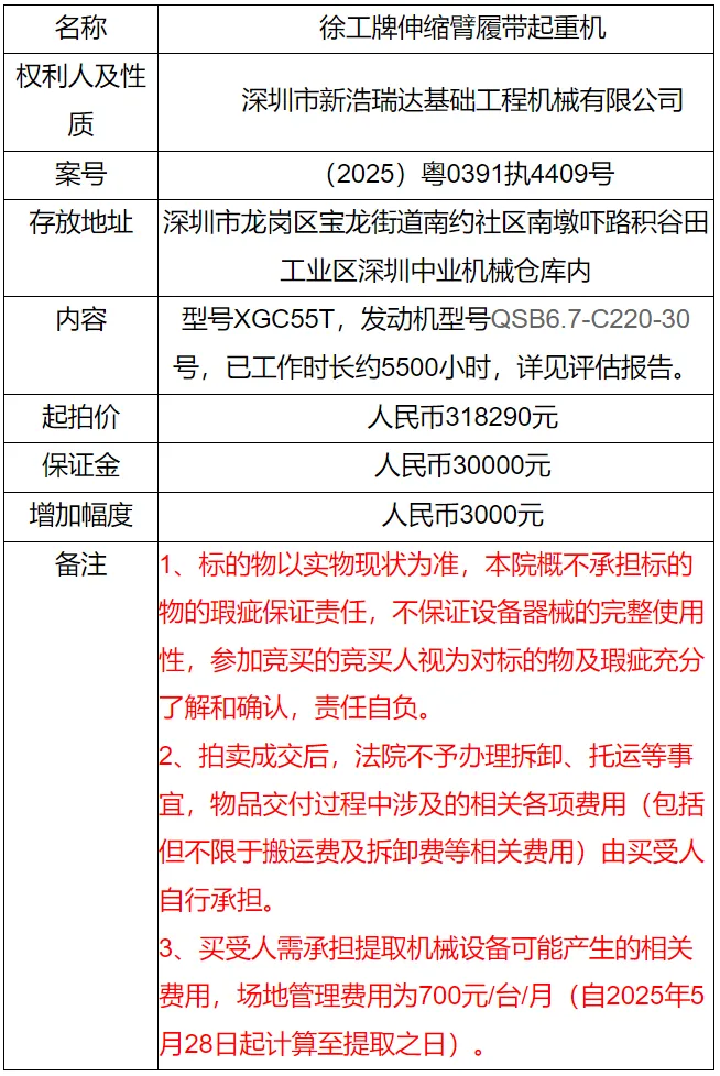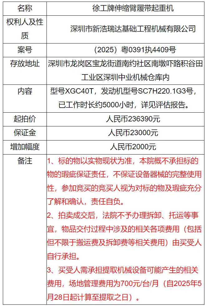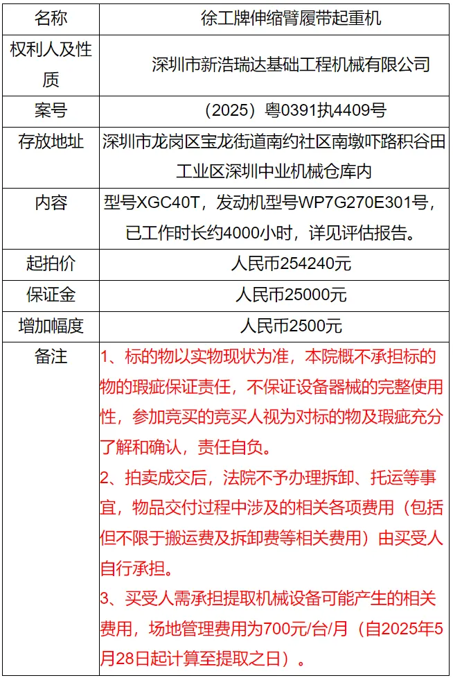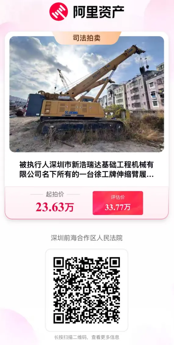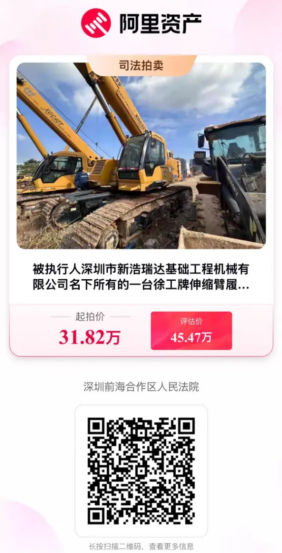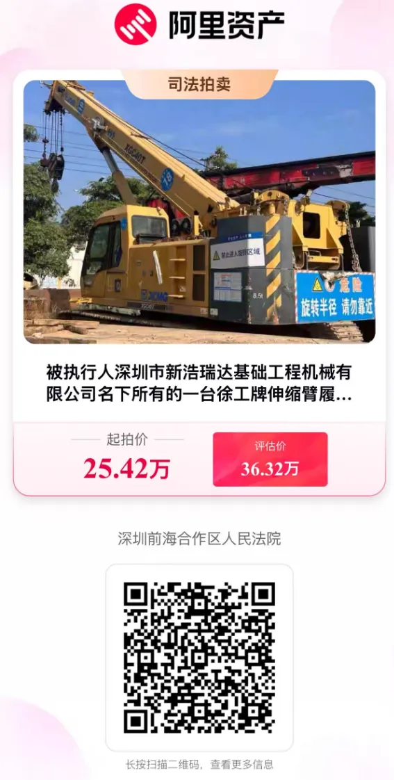 广东省深圳前海合作区人民法院将于2026年4月8日10时至2026年4月9日10时止(延时除外)在深圳前海合作区人民法院淘宝网司法拍卖网络平台上进行公开拍卖活动03 被执行人深圳市新浩瑞达基础工程机械有限公司名下所有的一台徐工牌伸缩臂履带起重机(型号XGC40T)