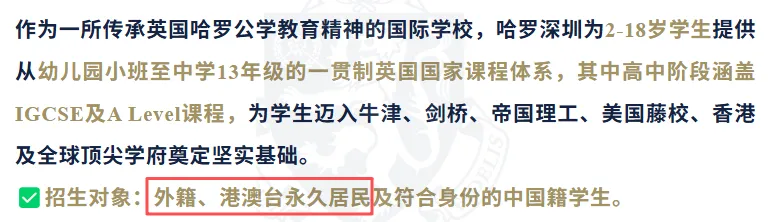 哈罗国际学校/深圳国王学校:往年认可临时港籍,2026年招生简章已将“港澳台居民”修订为“港澳台永久居民”,临时身份资格被取消。