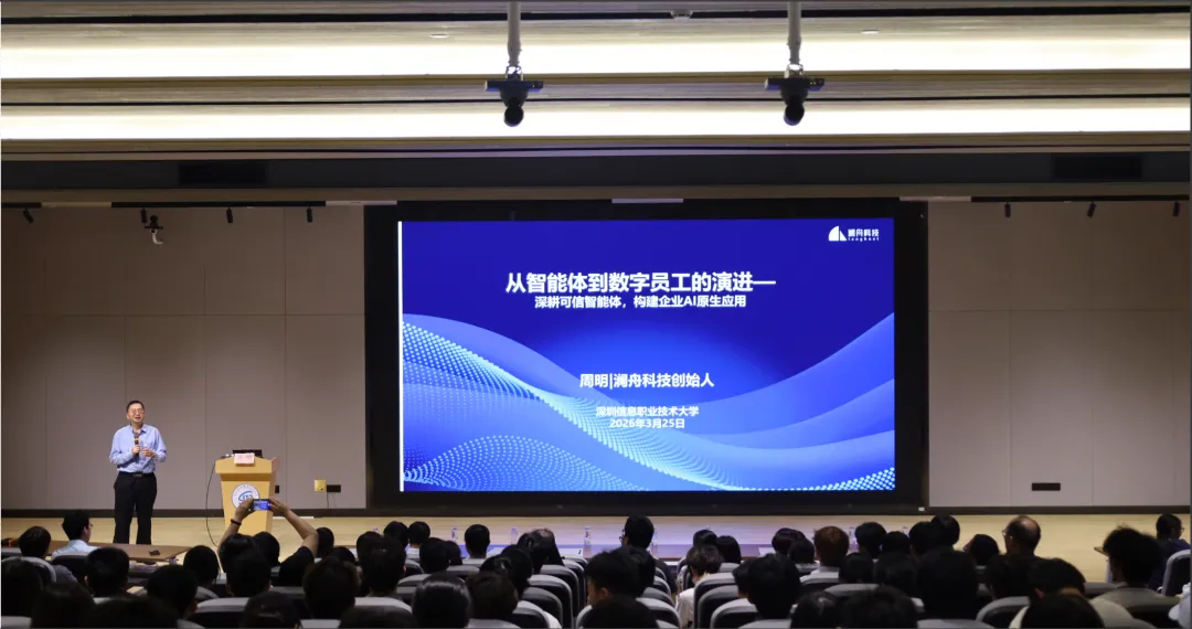 王晖校长在讲座前亲切会见了周明博士。深圳信息职业技术大学作为粤港澳大湾区特色鲜明的信息技术类应用型高校,聚焦人工智能、大数据、智能制造等前沿领域,构建“教学—科研—产业”一体化育人体系。王晖校长、谭旭院长与周明博士深入探讨了关于人工智能教学、科研的校企合作。双方未来将围绕智能体技术研发、OPC创新体系、人才培养、实训基地共建等方面展开全面合作,共同推动智能体与OPC技术在职业教育与产业实践中的创新落地。