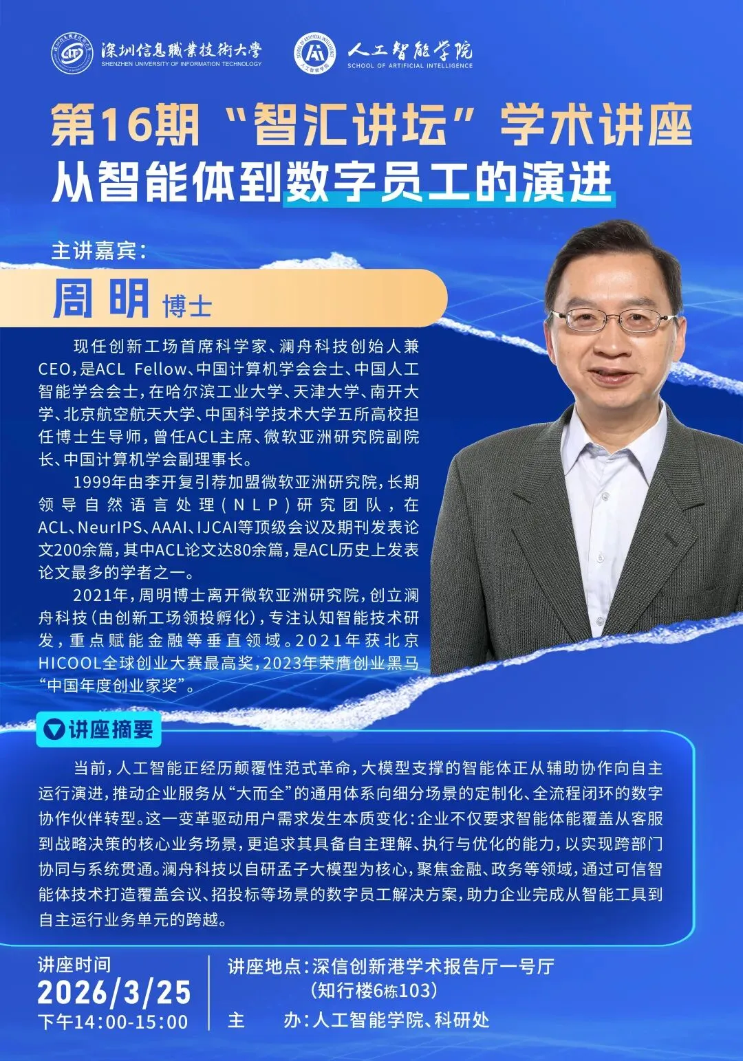 16期“智汇讲坛”。 澜舟科技创始人兼首席执行官周明博士应邀作《从智能体到数字员工的演进》专题报告。