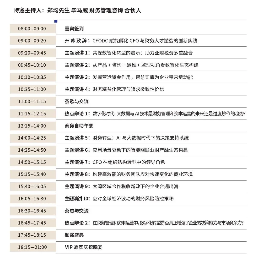本次大会将聚焦财务转型过程,特别是在基于财务洞察与趋势预测方面,探讨如何有效利用数字化手段提升决策效能,促进财务管理创新,赋能价值创造以及催生资本运营的变革。届时将围绕企业财务、资本与战略三大主线,汇集精英智慧、交流经验心得,共同创造大湾区规模空前、水平一流及影响力超强的财经金融盛会要点。