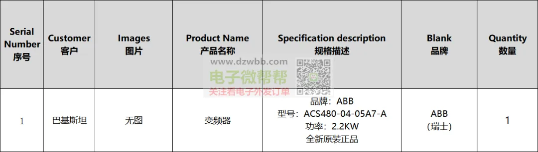 ABB品牌变频器厂家请联系,数量:1台!品牌:ABB,型号:ACS480-04-05A7-A,,全新原装正品,出口巴基斯坦。要求:供应商有跟外贸公司合作和出口经验的,可以收美金且能报关,请优先按顺序报含报关FOB离岸美金价/未税价格,符合要求的代理商和经销商请+V:(非手机号,10位数),中间商勿扰发布时间:今天