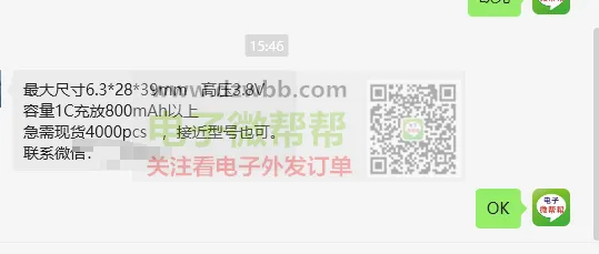急需现货4000pcs,接近型号也可!最大尺寸6.3*28*39mm 高压3.8V容量1C充放800mAh以上发布时间:今天