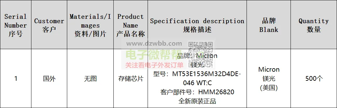 Micron镁光存储芯片厂家请联系,首单:500个!品牌:Micron镁光,型号:MT53E1536M32D4DE-046 WT:C,数量:500个(必须为可拆包),全新原装正品,出口国外。要求:供应商有跟外贸公司合作和出口经验的,可以收美金且能报关,请优先按顺序报含报关FOB离岸美金价/未税价格,符合要求的代理商或经销商请+V:(非手机号,10位数),中间商勿扰。发布时间:今天