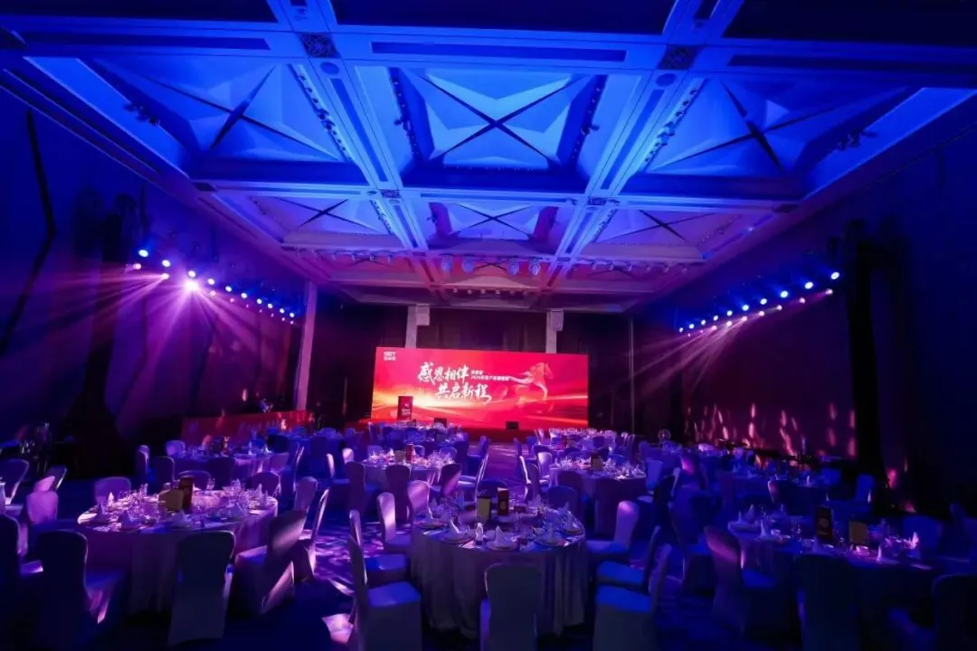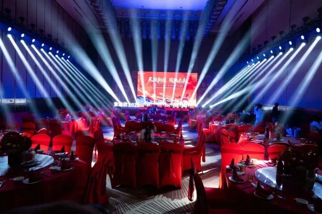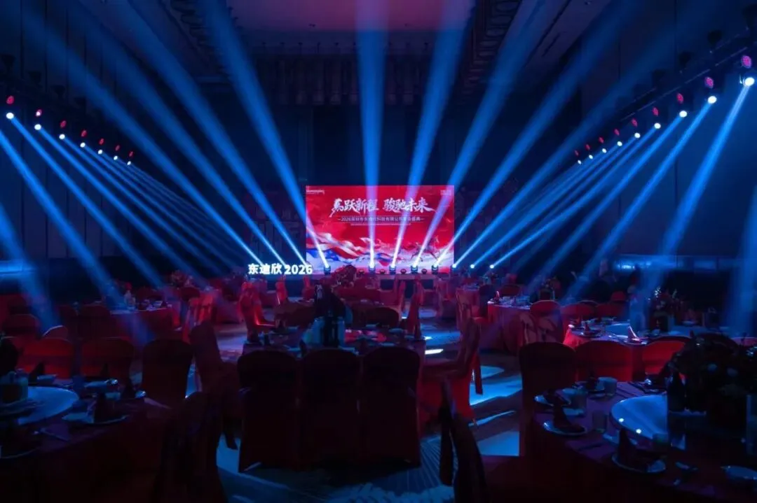 论坛的成功举办,再次证明了我们在高端学术论坛和行业会议领域的专业能力。无论是设备稳定性还是现场操作经验,我们都经得起考验。东迪欣“燕跃新程·骏驰未来”2026年会热烈举行。这是一场充满活力与激情的内部年会,员工表演、抽奖互动、表彰环节轮番上演,对灯光和音响的动态表现力要求极高。- 舞台灯光是这场活动的灵魂。我们布置了多台电脑光束灯和LED染色灯,配合音乐节奏实现光束扫射、色彩变幻等效果。当员工表演劲歌热舞时,灯光随着节拍跳动,现场气氛瞬间点燃;当进入抽奖环节时,灯光聚焦舞台中央,大屏幕滚动名单,紧张与期待交织。