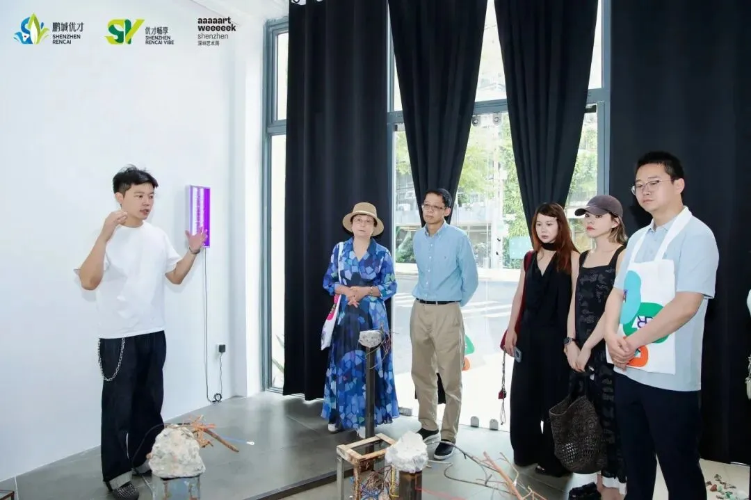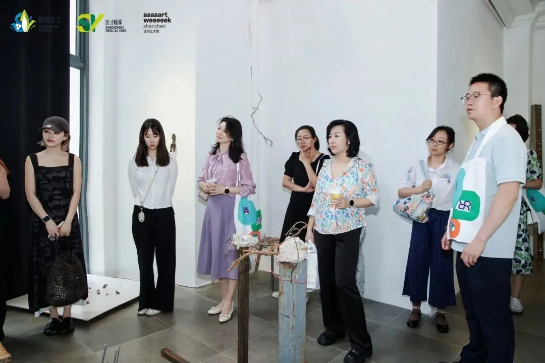 最后一站来到南海意库,参与者依次走访蛇口画廊、BAProject计划单位及PETITREE。蛇口画廊负责人介绍称,本次展览由三位毕业于中央美术学院的“95后”艺术家联合展出,他们以各自的艺术语言探讨权利、生命与情感。BAProject计划单位负责人为参与者讲解本次展览的构想,是艺术家从郊区废品回收站与建筑工地获取材料,通过镀铜、导电等方式,将人造物与自然物弥合于同一系统,隐喻城市扩张与离心力作用下被边缘化的存在。PETITREE负责人告诉大家在展览呈现的创作中,艺术家利用AI与冰川素材构建的声音装置,将自然中人类无法触达的声响以算法“翻译”出来,引发对技术、自然与感知边界的思考。
