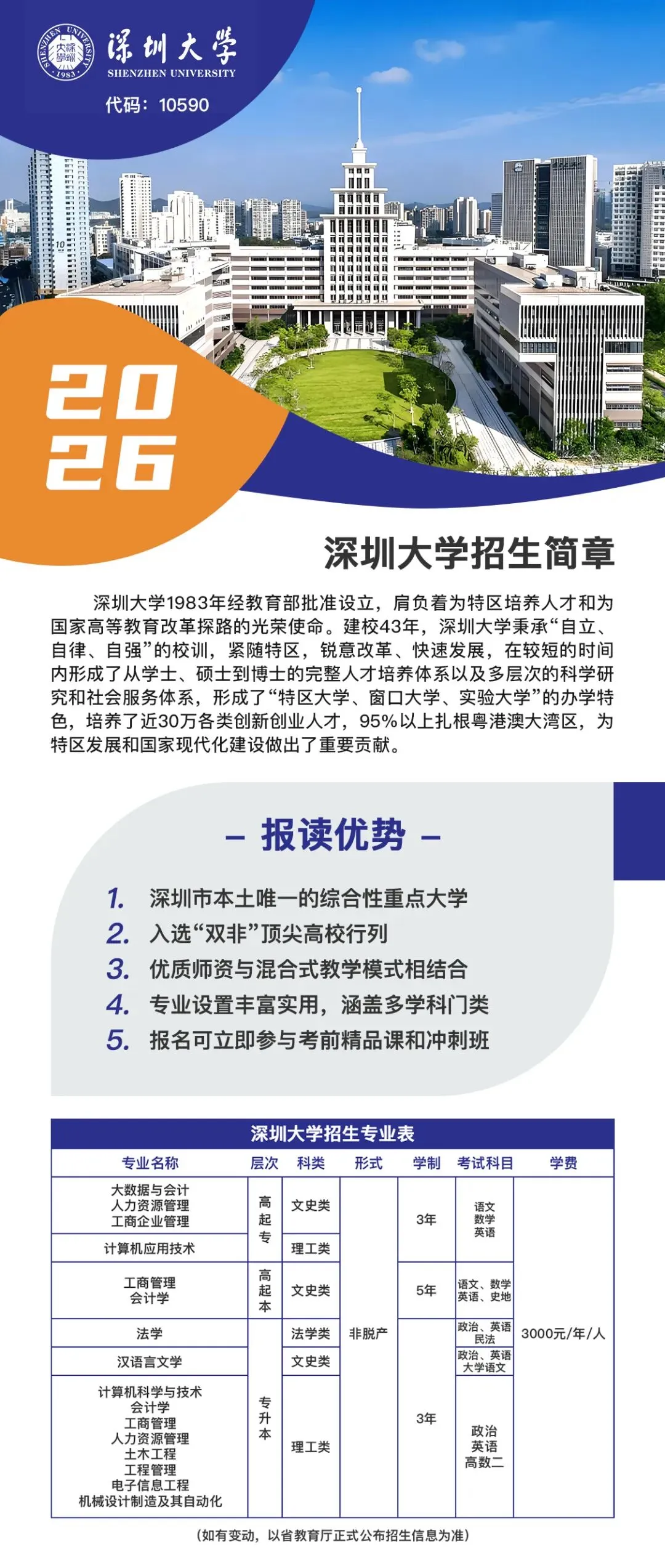 深圳大学1983年经教育部批准设立,肩负着为特区培养人才和为国家高等教育改革探路的光荣使命。中央、教育部和地方高度重视深圳大学建设,组织北大援建中文、外语类学科,清华援建电子、建筑类学科,人大援建经济、法律类学科,一大批知名学者云集深圳大学。建校伊始,学校在高校管理体制上锐意改革,在奖学金、学分制、勤工俭学等方面进行了积极探索,率先在国内实行毕业生不包分配和双向选择制度,推行教职员工全员聘任制度和后勤部门社会化管理改革,为中国高等教育改革做出了重要贡献。深圳大学是国家大学生文化素质教育基地、全国文明校园、全国民族团结进步示范学校。