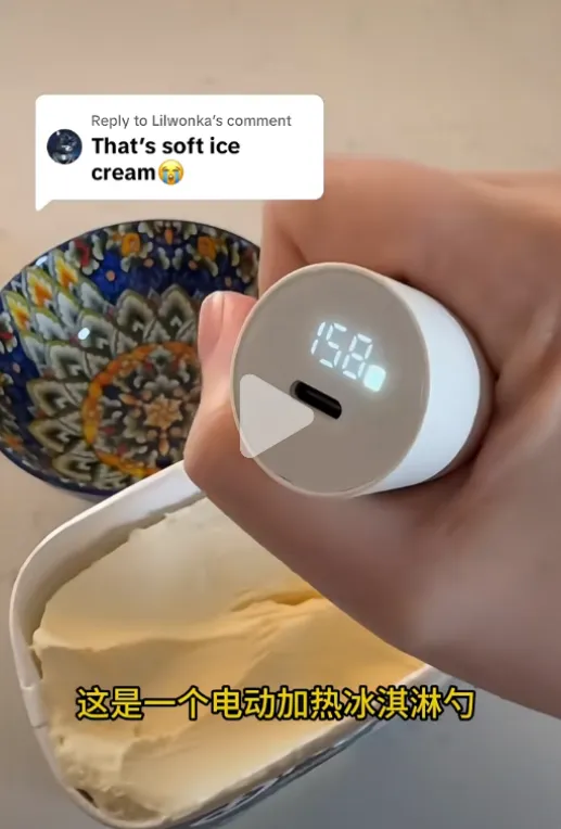 这把电热勺的设计逻辑其实很简单:用热刀切黄油,用热勺挖冰淇淋。 它的秘密藏在手柄里。内置2000mAh充电电池,握住手柄后,勺头会迅速加热到70摄氏度。当你触碰到冰淇淋时,表层瞬间微融,勺子能像切豆腐一样滑入冰淇淋内部,轻松挖出圆润的冰淇淋球,完全不需要“使劲”。更重要的是,它很聪明:智能触控设计,只有握住手柄才会加热;IP67级防水,挖完后可以直接在水龙头下冲洗;勺头采用食品级不锈钢,安全又耐用。“这不只是一个勺子,这是一个冰淇淋体验的革命。”一位TikTok博主在视频中这样评价,收获了数万点赞。从深圳工厂到海外爆款:一场精准的“痛点狙击”