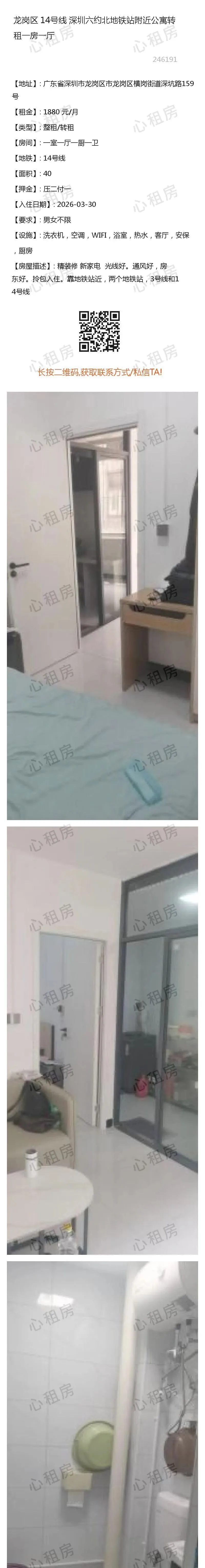 深圳租房【龙岗2则】房源①:14号线深圳龙岗六约北地铁站附近转租一房一厅1880元/月;房源②:…