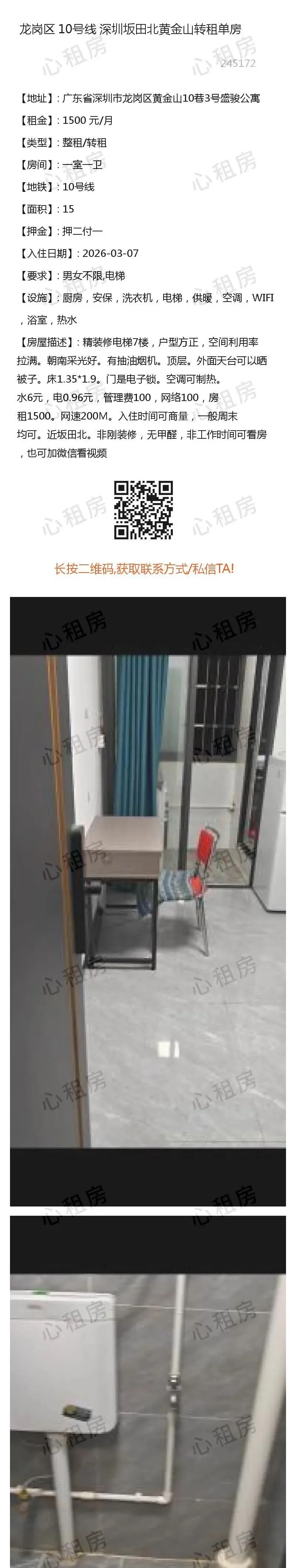 深圳租房>>龙岗区10号线贝尔路 坂田北 黄金山转租单房1500元/月