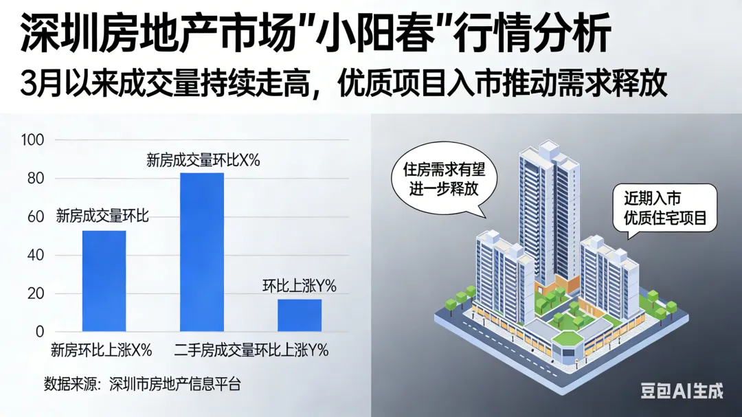 今年3月以来,广东省深圳市房地产市场迎来一波热度,“小阳春”行情显现。新房、二手房成交量环比持续走高,市场明显回暖。随着近期一批优质住宅项目陆续入市,住房需求有望进一步释放。