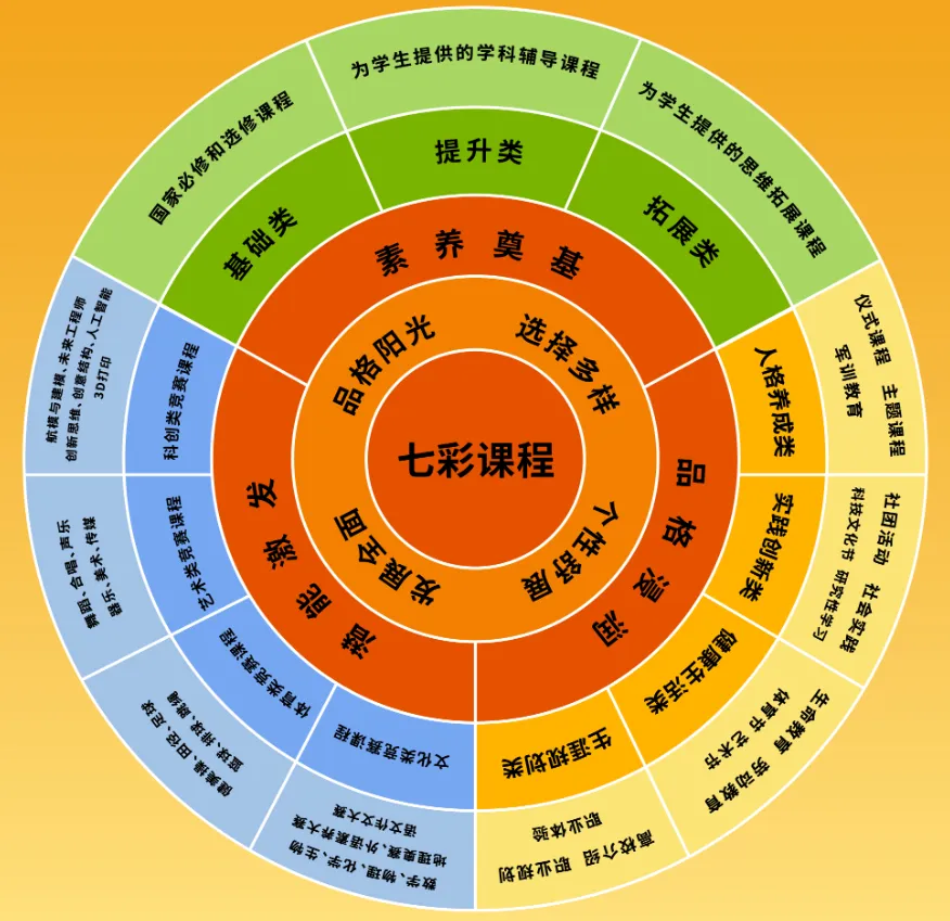 七高在“素养奠基-品格浸润-潜能激发”三位一体的多元培养体系之下,构建了与之相匹配的“七彩课程体系”,旨在培养出品格阳光、选择多样、个性舒展、发展全面的优秀学子。