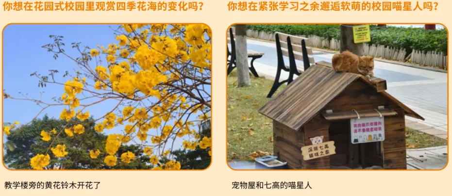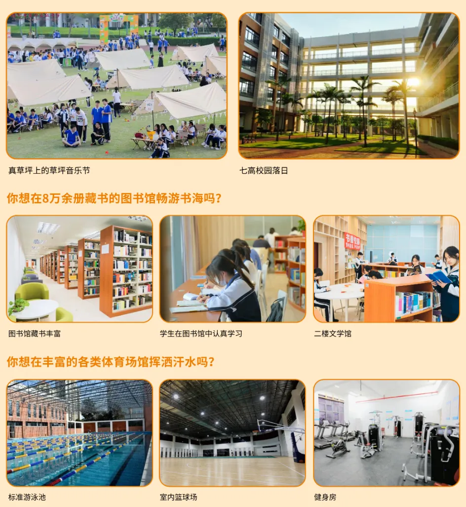 七高是“广东省绿色学校”,被誉为“宝安区最美校园”。学校占地近10万平方米,拥有标准化的真草坪足球场、赛事级游泳馆及网球场,还有篮球场11个、室内羽毛球场6个、乒乓球台27张、专业舞蹈室3间,满足学生多样化运动需求。图书馆现藏书8万余册,曾获评“广东省中小学最美阅读空间”“深圳市最美图书馆”,课余时间可观赏绚烂的晚霞,漫步于校园玫瑰园、桃李园、槐园和桂园,感受四季花海的流转之美,是名副其实的“花季”校园。