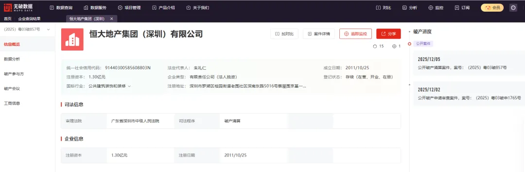 3月23日新闻,3月18日,深圳市中级人民法院发布民事裁定书,正式宣告恒大地产集团(深圳)有限公司进入破产清算程序。