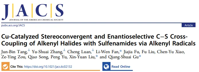Cu-Catalyzed Stereoconvergent and Enantioselective C−S Cross-Coupling of Alkenyl Halides with Sulfenamides via Alkenyl Radicals, Journal of the American Chemical Society, 2026, DOI: 10.1021/jacs.6c02132