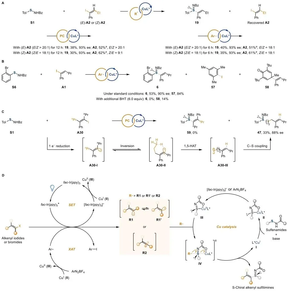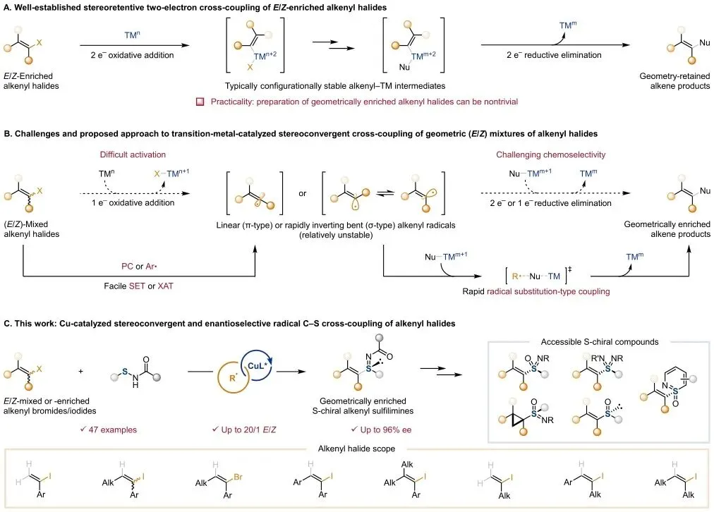 研究采用可见光驱动SET或芳基自由基介导XAT策略活化烯基卤化物,经铜/手性配体催化实现不对称C-S键形成,构建S-手性亚砜亚胺。