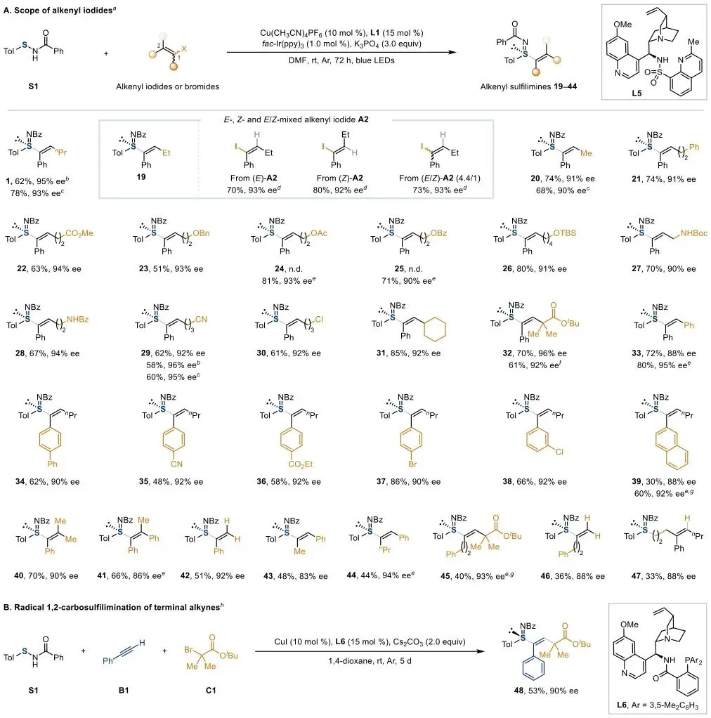 图2 | 烯基碘的底物范围及炔烃自由基1,2-碳亚砜亚胺化反应的拓展。a标准反应条件:硫代酰胺S1(0.20 mmol),烯基碘A(1.5当量),Cu(CH₃CN)₄PF₆(10 mol%),L1(15 mol%),fac-Ir(ppy)₃(1.0 mol%),K₃PO₄(3.0当量),DMF(2.0 mL),室温,氩气,蓝光LED照射72 h。b使用(Z)-烯基碘(Z)-A1或(Z)-A12。c使用(E/Z)-混合烯基碘((E/Z)-A1: 6.5/1; (E/Z)-A3: 2.8/1; (E/Z)-A12: 1/1.3)。d粗反应混合物的¹H NMR分析测定19的E/Z比(>20:1)。e硫代酰胺S(0.20 mmol),烯基碘A(1.5当量),CuI(10 mol%),L1(15 mol%),MesN₂BF₄(2.0当量),K₃PO₄(3.0当量),MTBE(4.0 mL),室温,氩气,4天。f使用A5-Br代替A15-I。g使用L5(15 mol%)代替L1。h硫代酰胺S1(0.10 mmol),炔烃B1(2.0当量),叔丁基α-溴代异丁酸酯C1(3.0当量),CuI(10 mol%),L6(15 mol%),Cs₂CO₃(2.0当量),1,4-二氧六环(1.0 mL),室温,氩气,5天。产率为分离产率,ee值由手性HPLC分析测定。Tol,对甲苯基;N.d.,未检测到。
