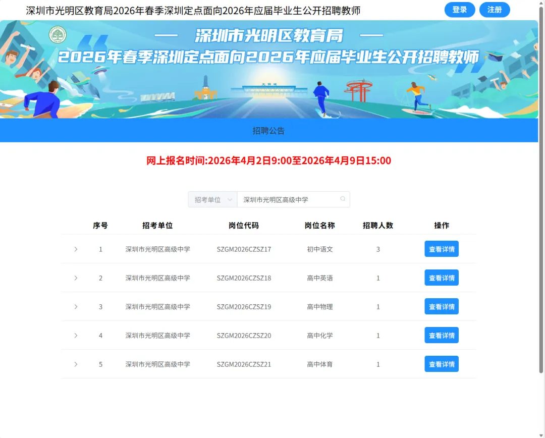 4. 深圳市光明区高级中学的具体岗位详情,须扫描二维码查看附件《深圳市光明区教育局2026年4月深圳定点面向应届毕业生公开招聘教师岗位表》(第17至21项)内容。