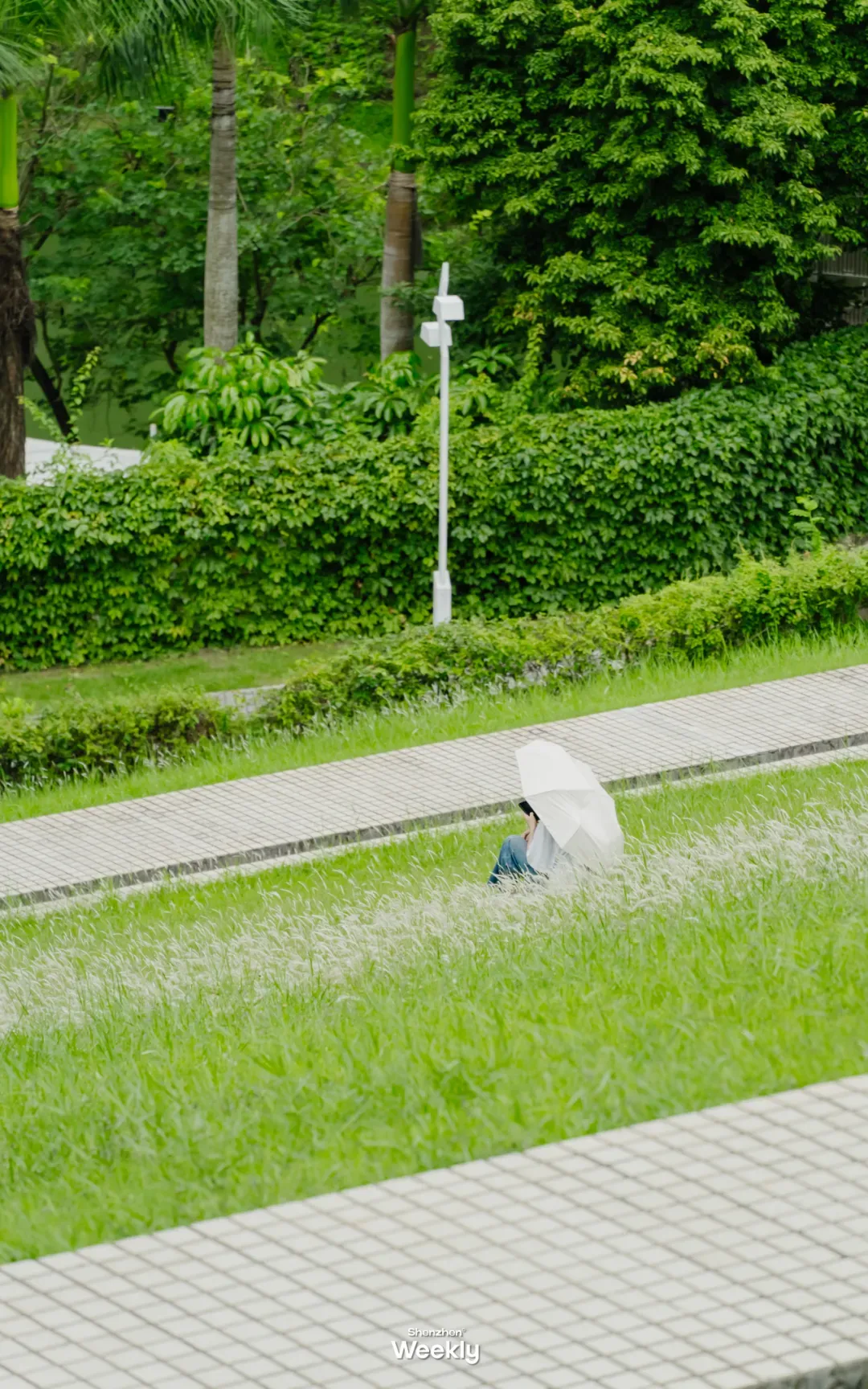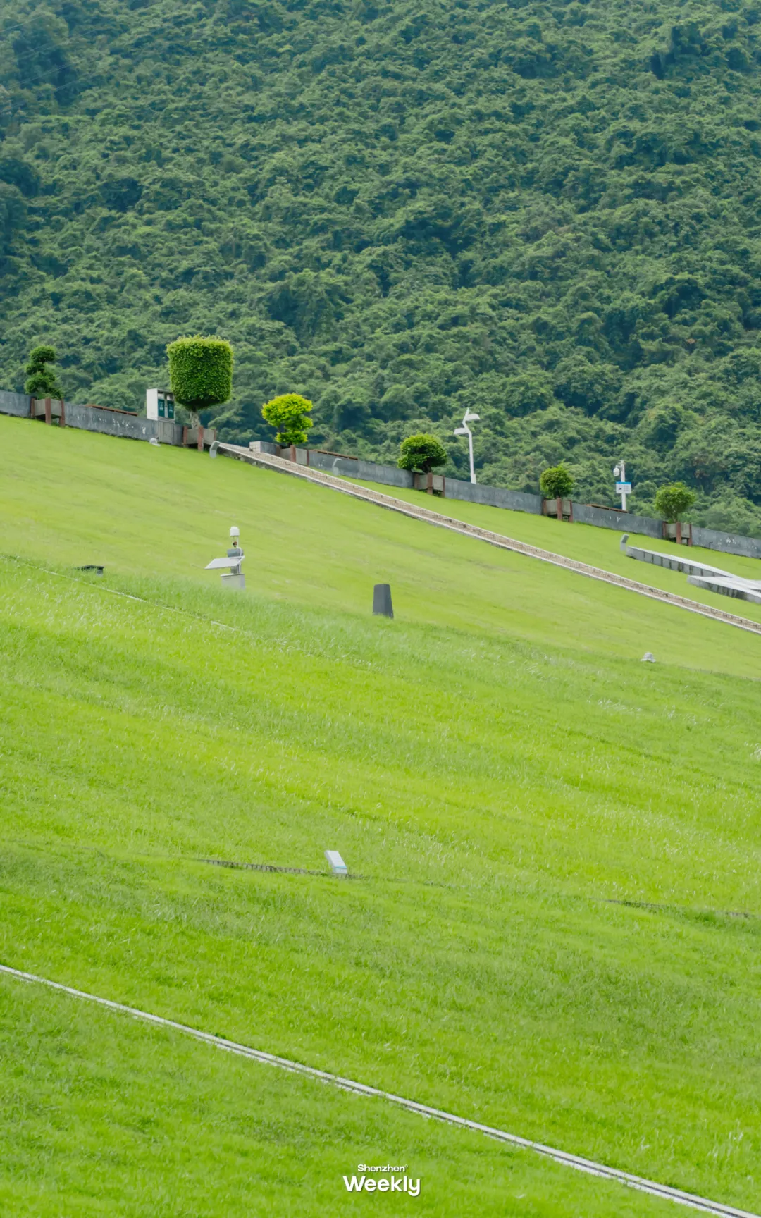 坐在堤坝边上,望着铺满斜坡的绿草,远处是福田CBD的高楼大厦。只要在长椅上坐半个钟头,就能暂时躲开手机里那些工作消息。
