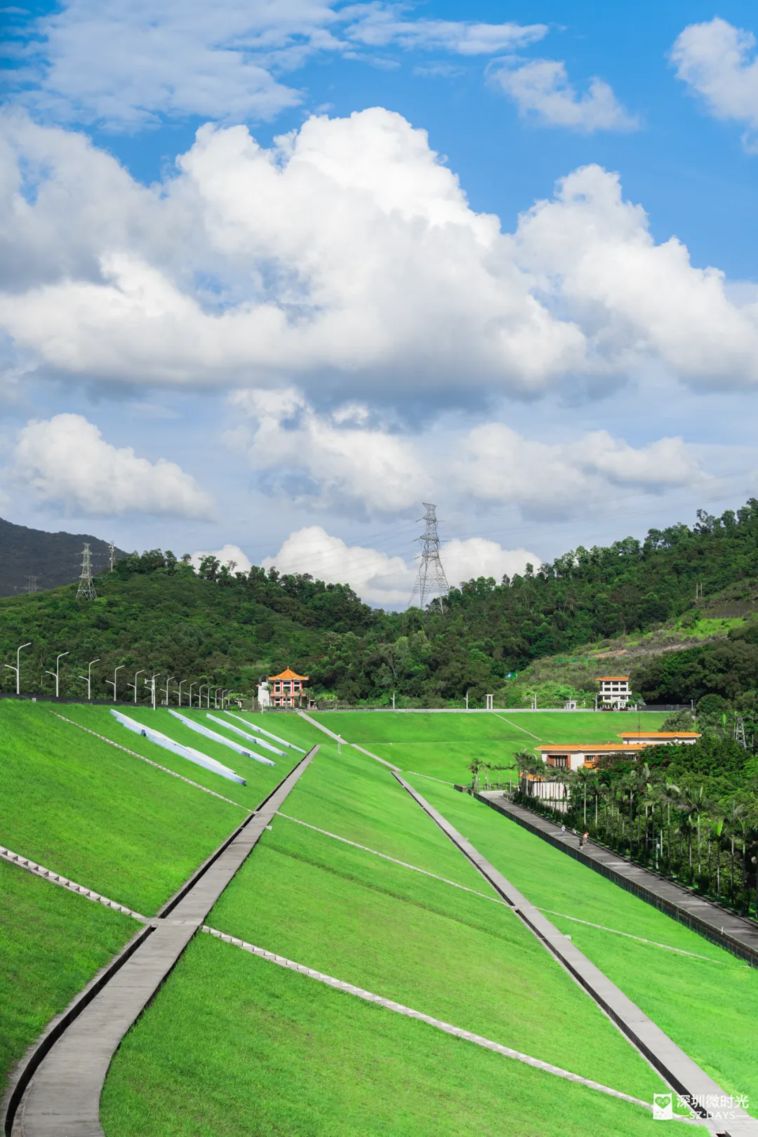 这里的风景,像是从宫崎骏动画里走出来的。天蓝得透亮,云飘得自在,大坝斜坡上的草齐齐整整,远远看去像铺了层绿毯子,安安静静地铺在那儿。
