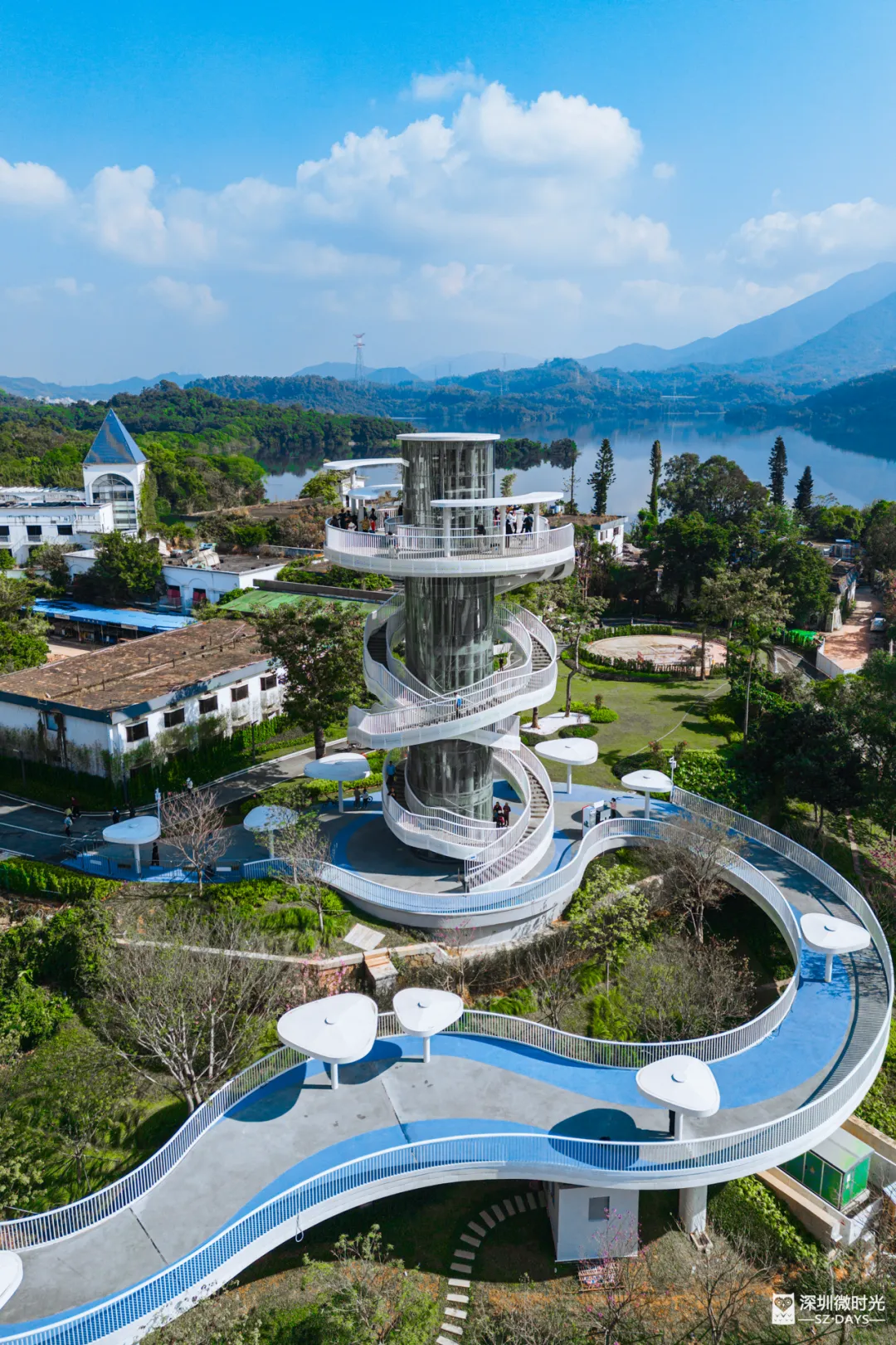 顺着大坝往前走,抬眼就能看见湖光塔。这是环深圳水库绿道的核心建筑,高19.5米,钢架和金属网搭出通透的造型,远远看着像浮在半空。