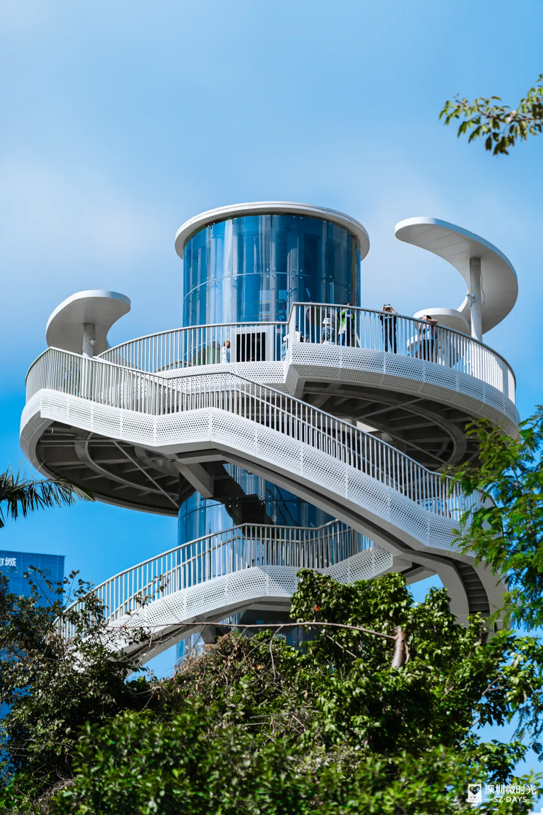塔外绕着双螺旋步道,慢慢走上去,每绕一圈,眼前的风景就换一副模样。站到顶上之后才发现,这地方选得真好。