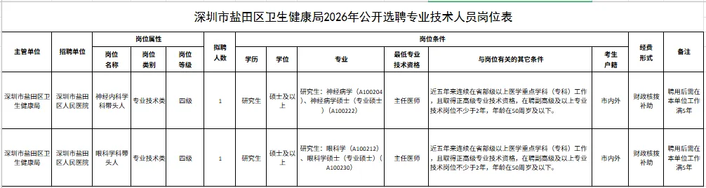深圳市盐田区卫生健康局2026年公开选聘专业技术人员公告