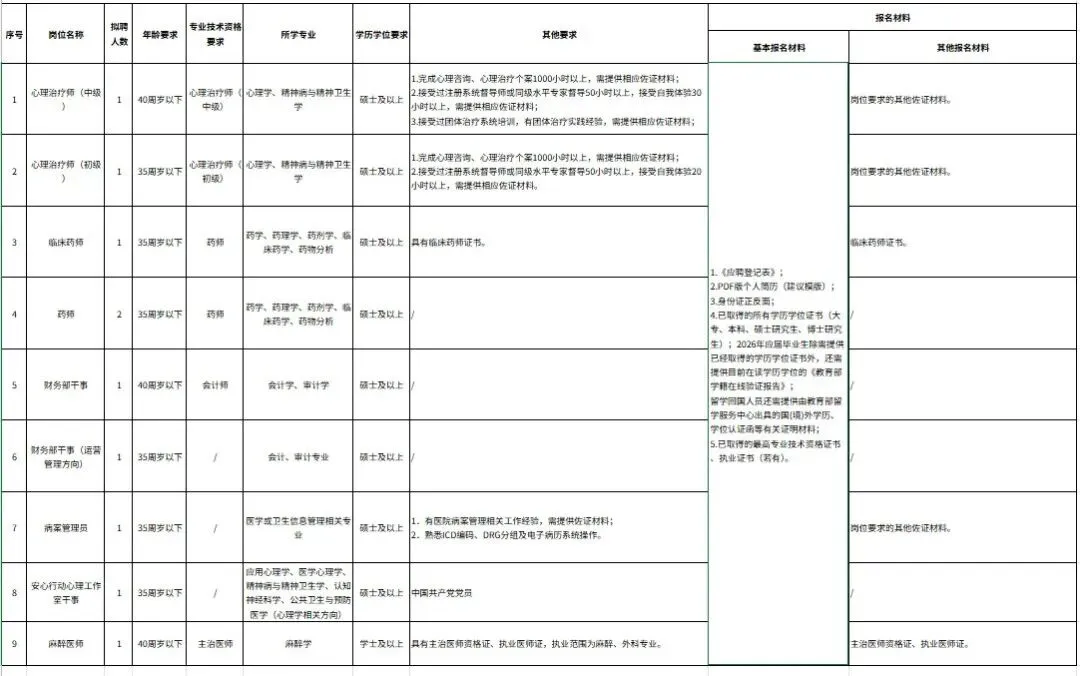 一、招聘岗位、数量(一)心理治疗师(中级)1名。(二)心理治疗师(初级)1名。(三)临床药师1名。(四)药师2名。(五)财务部干事1名。(六)财务部干事(运营管理方向)1名。(七)病案管理员1名。(八)安心行动心理工作室干事1名。(九)麻醉医师1名。岗位具体要求见《招聘岗位表》(附件1)。
