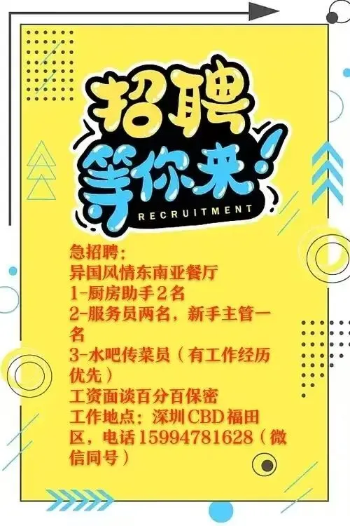 罗湖茶餐厅招1名熟手服务员4500-5000元,月休4日,假期另补,包吃包住,电话13168175448