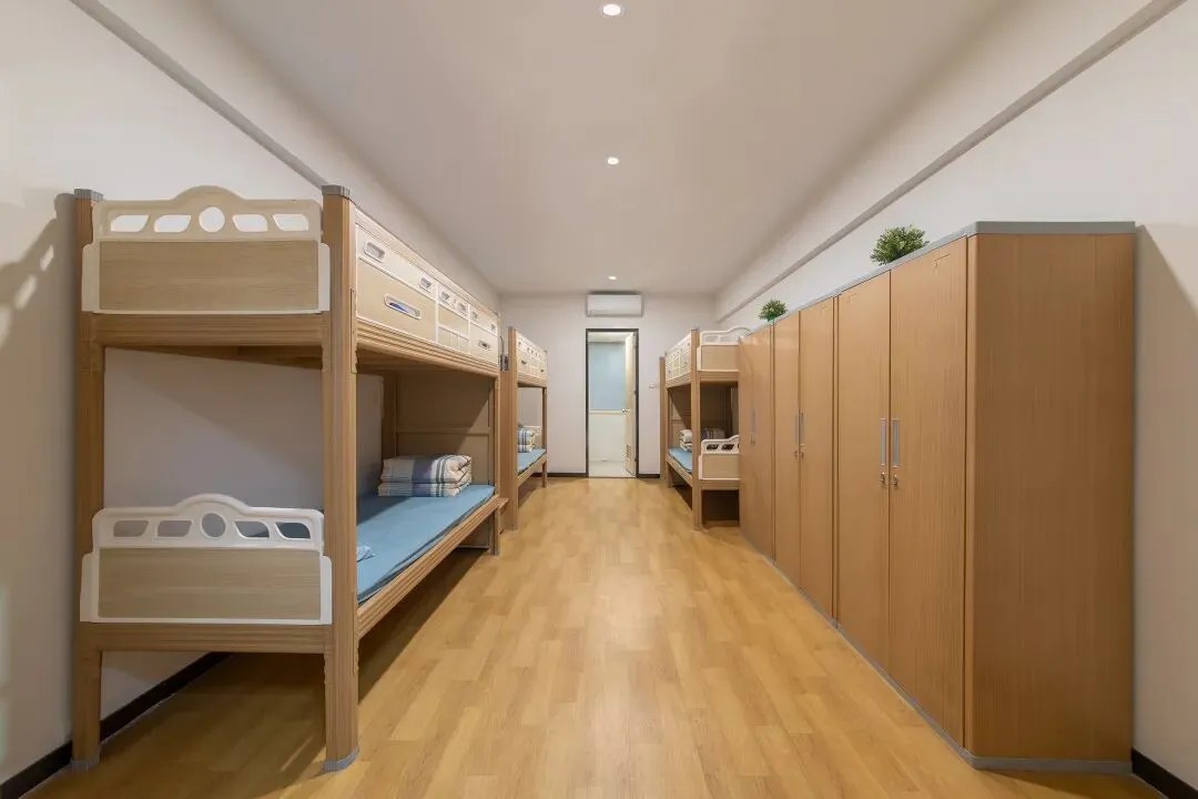6人间宿舍,配备空调、独立卫浴;生活老师24小时驻楼管理,定期开展“宿舍文化节”,培养独立生活能力。