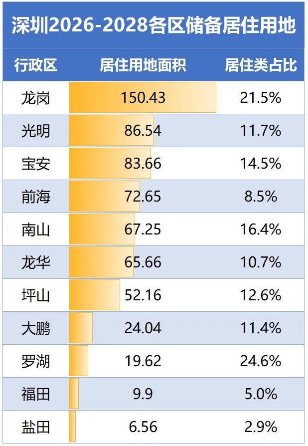 储备居住用地最多的是龙岗区,约150.43公顷,也是唯一超过100公顷的行政区。
