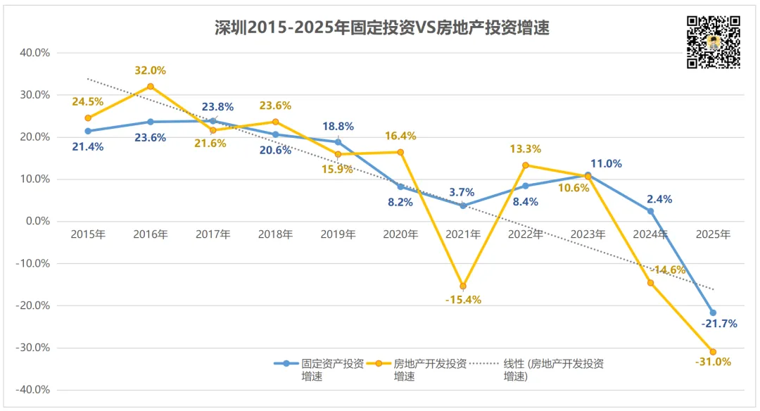 但2025年,深圳固定资产投资增速创新低,跌幅也大大超过主要城市。